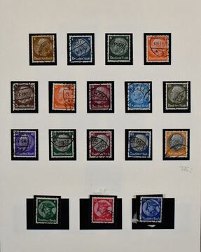 Deutsches Reich, 1933/1945, ohne die Blöcke und Nr. 496/98, nahezu kpl. Slg., gestempelt, teils auch ungebraucht, mit Nothilfe-Sätzen von 1933/1935, Nr. 695/99, Danzig-Abschied usw., bis Nr. 908. Dazu ein Ostropa-Block mit kaputtem Blockrand, von dem aber die Einzelmarken tadellos sind