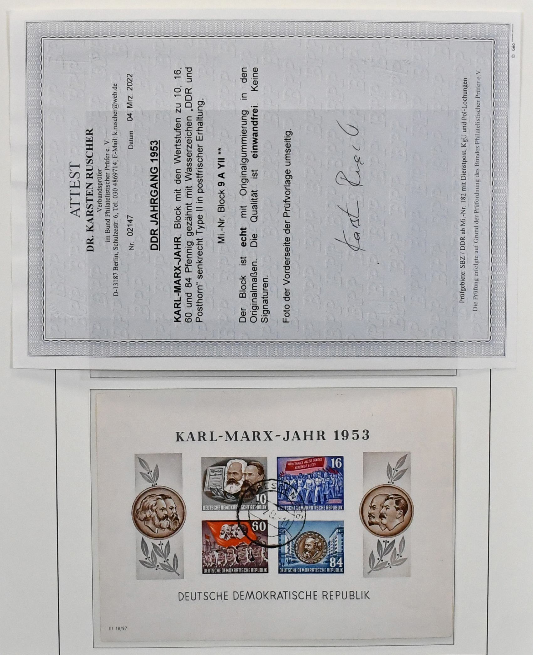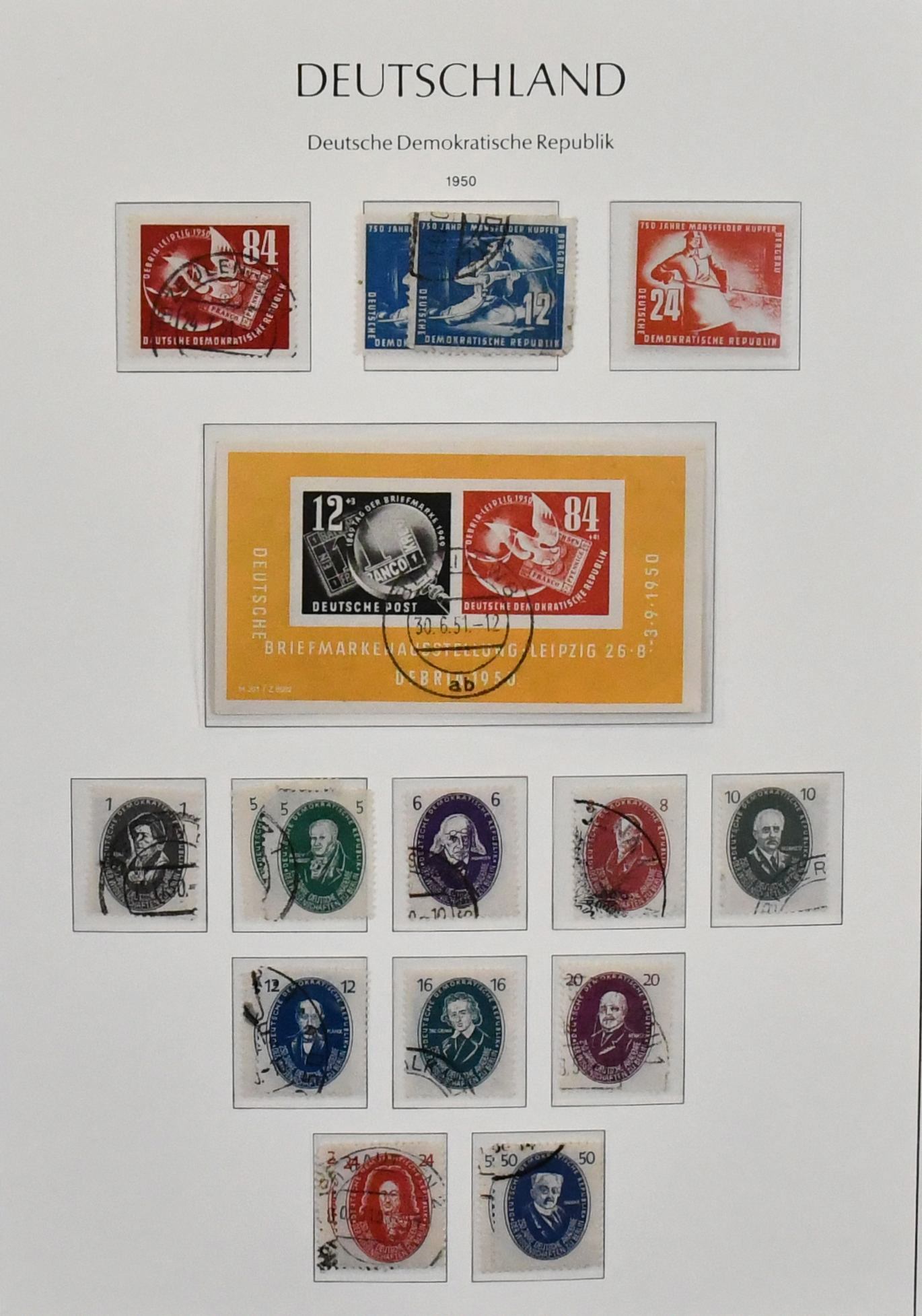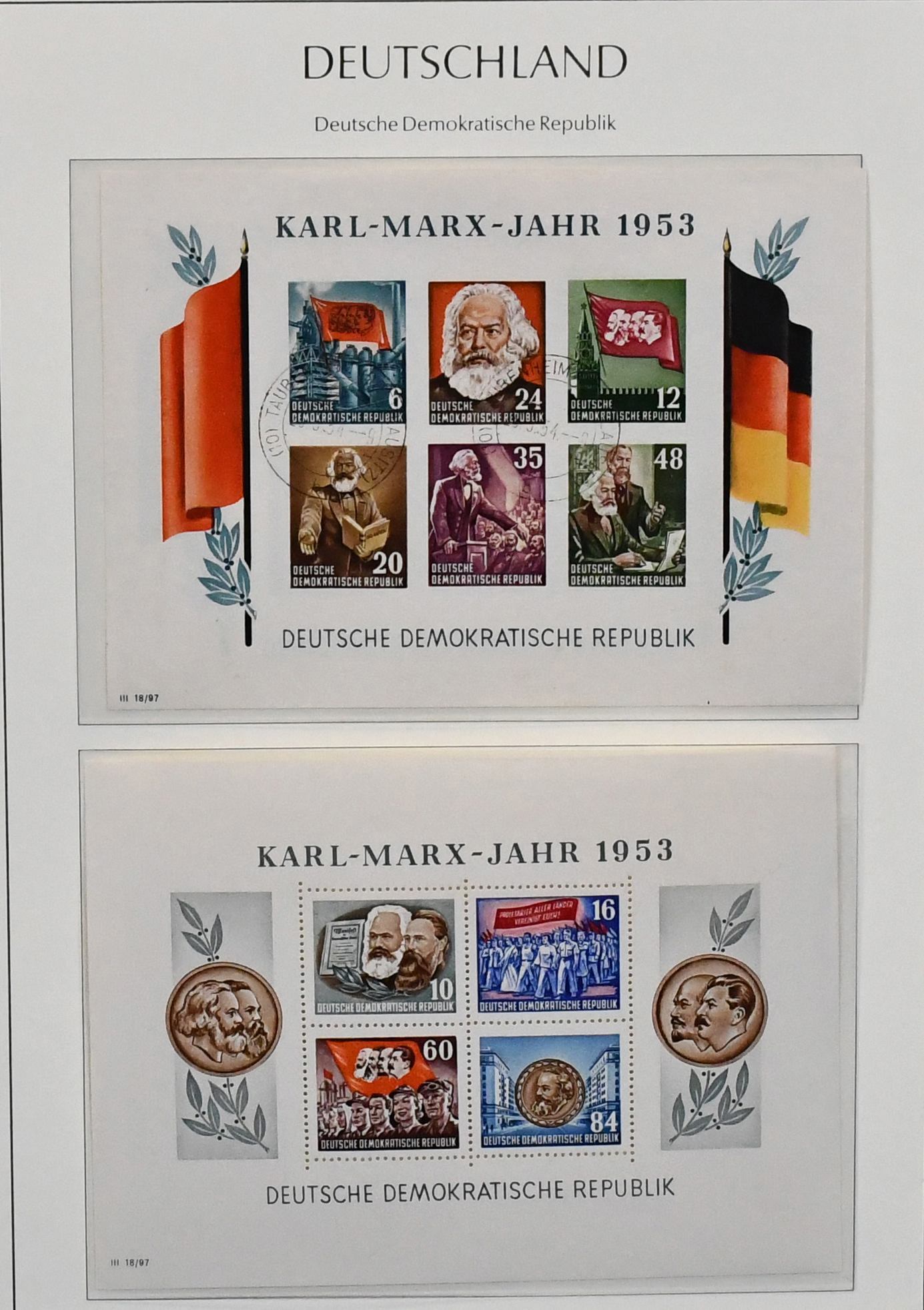 DDR, 1949-1970, meist postfrische (wenig ungebr.) Slg. in zwei Steckbüchern, annähernd kpl. (es fehlen nur Köpfe II, Nr. 405/22 u. ein paar Kleinwerte), dabei Pieck Nr. 255/59, Bach 1950, 261/70, Bl. 7, 286/88, 362/79, fünf Marx-Blöcke, Bl. 10/15, einige Plattenfehler wie Nr. 798I, ferner Markenheftchen-Partie mit u.a. MH 1a etc. Mi. 4000,-