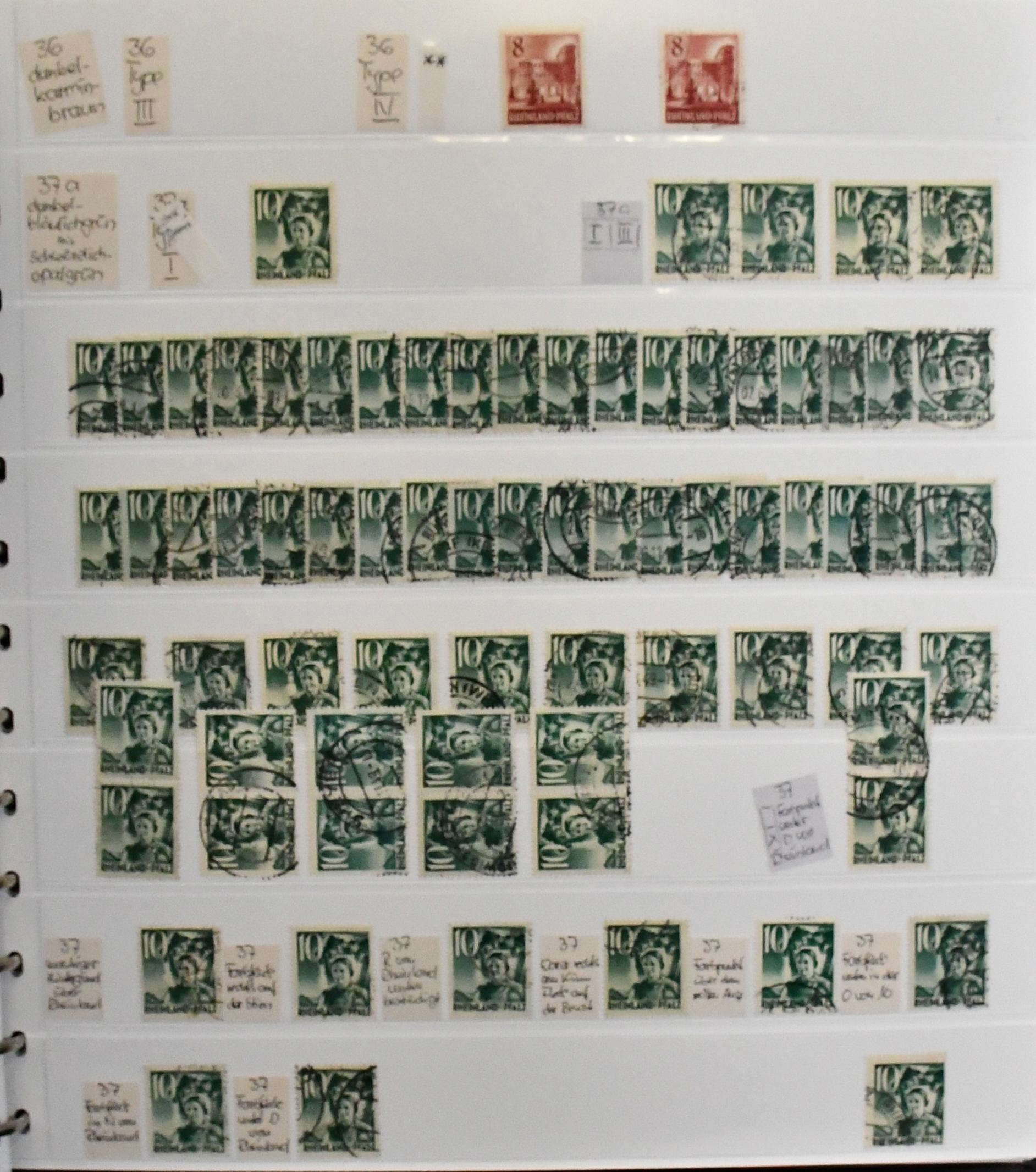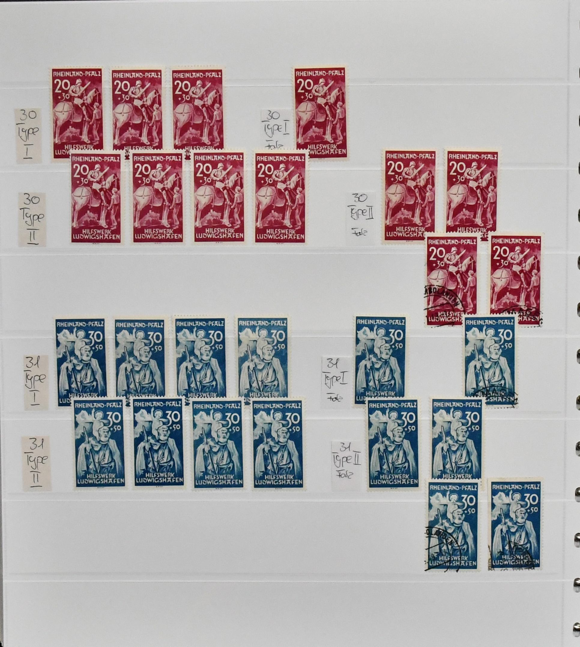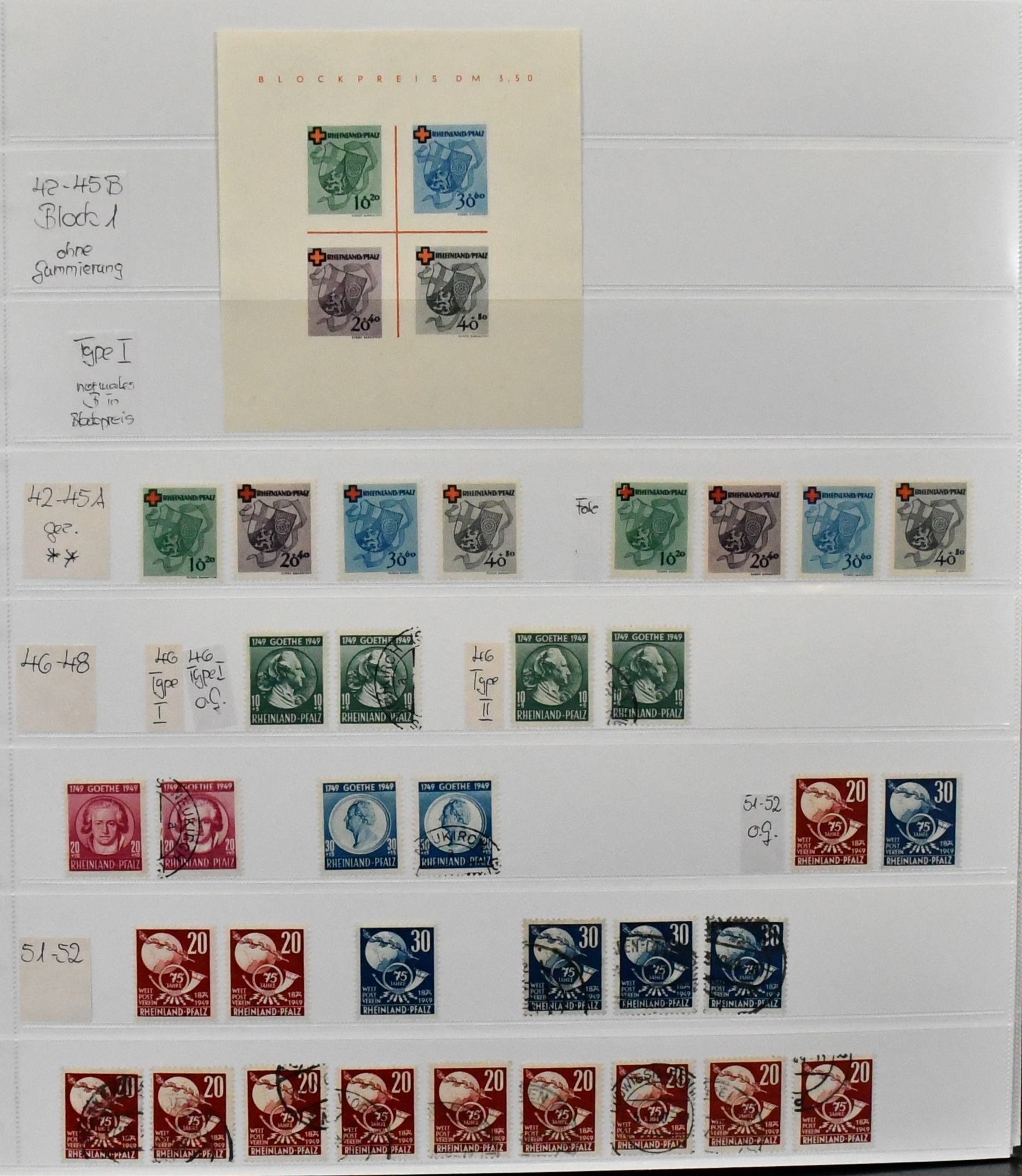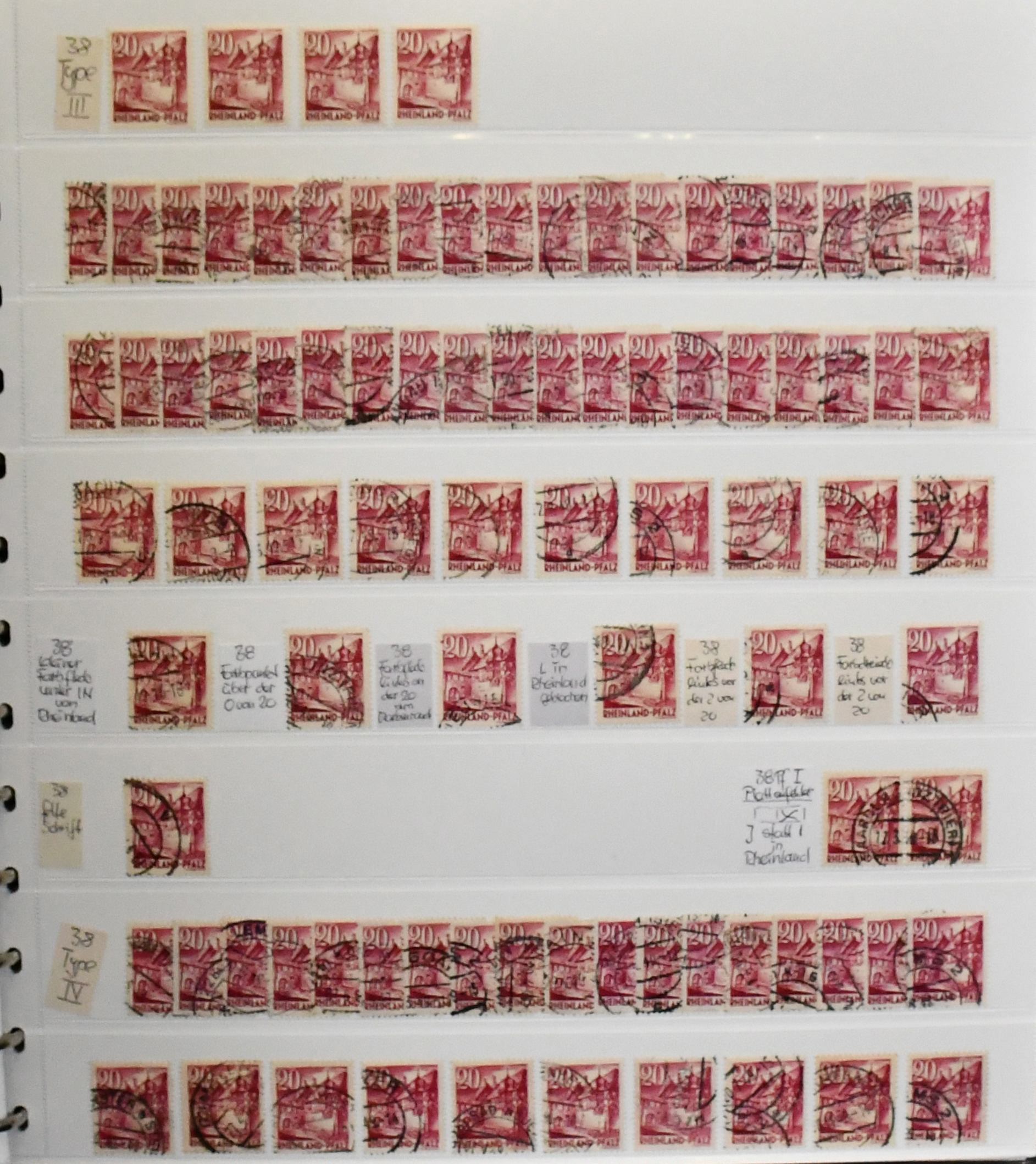 Rheinland-Pfalz, 1945/49, saubere Zusammenstellung von rund 3500 postfrischen u. gestempelten Werten in zwei SAFE-Ringbindern. Dabei die Freimarken-Ausgaben umfangreich nach Typen spezialisiert, inkl. Nr. 36 postfr. u. gest., sowie rund 100 Werte mit Plattenfehlern und Abarten, Rotkreuz-Satz und -Block postfr., Nr. 46/52 postfr. und gest. etc. Hoher KW!