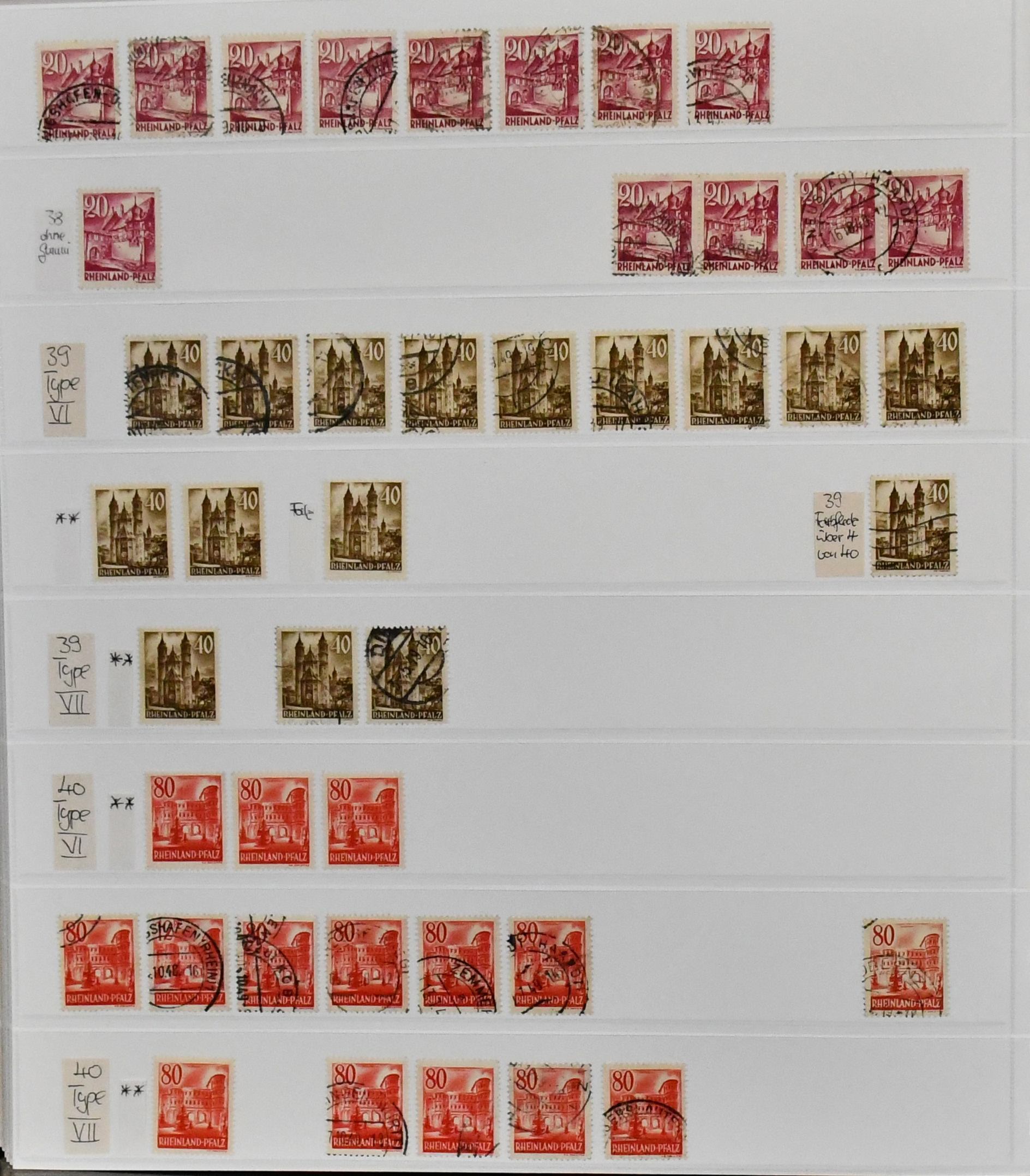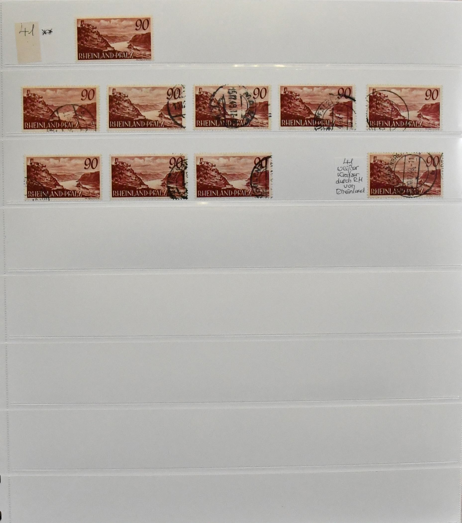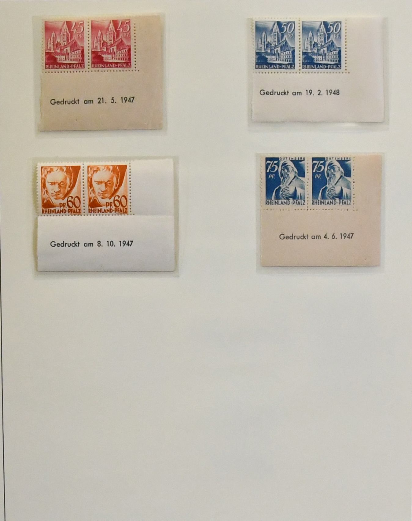 Rheinland-Pfalz, 1945/49, saubere Zusammenstellung von rund 3500 postfrischen u. gestempelten Werten in zwei SAFE-Ringbindern. Dabei die Freimarken-Ausgaben umfangreich nach Typen spezialisiert, inkl. Nr. 36 postfr. u. gest., sowie rund 100 Werte mit Plattenfehlern und Abarten, Rotkreuz-Satz und -Block postfr., Nr. 46/52 postfr. und gest. etc. Hoher KW!