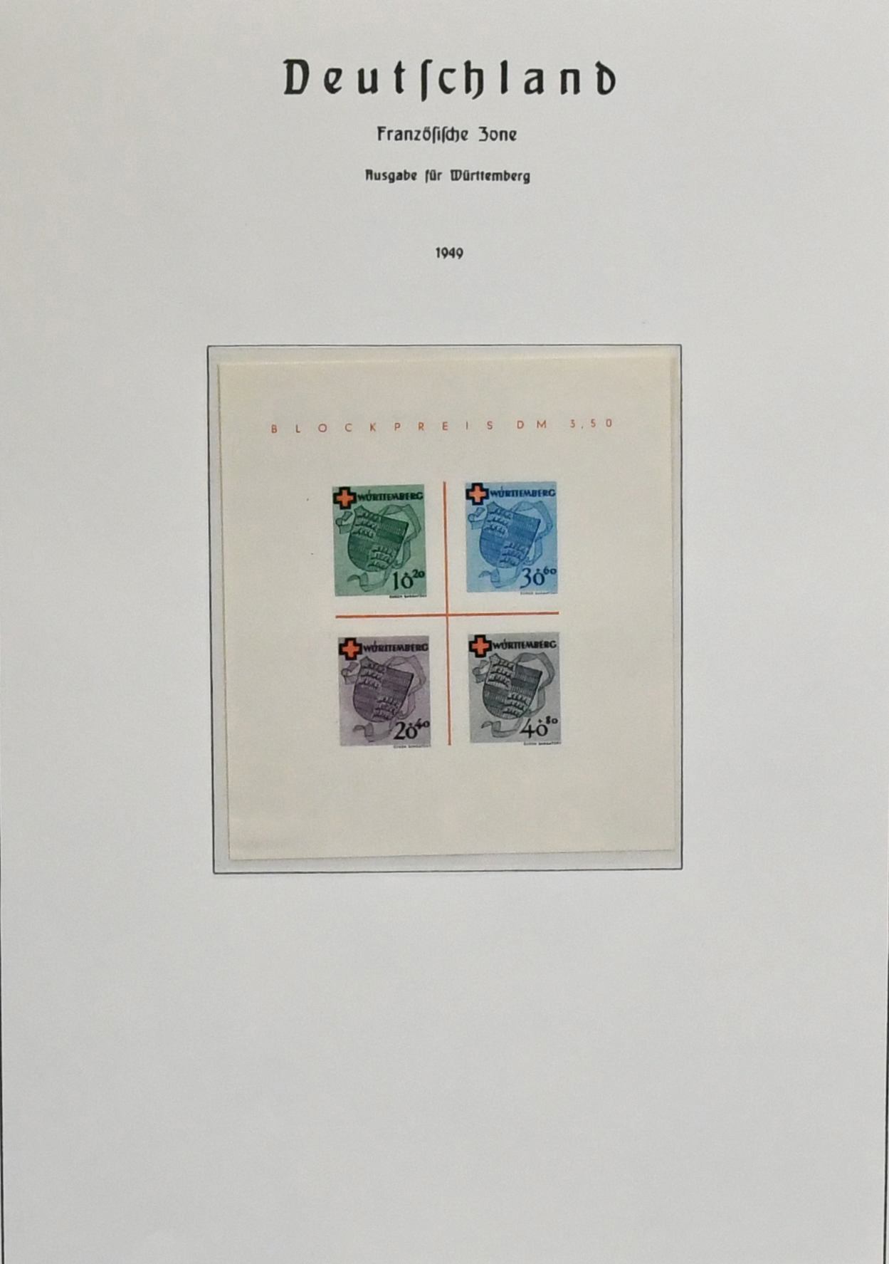 Französische Zone, 1945/49, nahezu komplette Slg., u.a. Baden kpl. inkl. Nr. 28/37 gest., Bl. 1A/B (einmal Mängel), Rotkreuz-Satz und -Block, Rheinland-Pfalz kpl., inkl. Nr. 30/41 gest. (Mi. 700,-), Rotkreuz-Satz und -Block, sowie Württemberg inkl. Nr. 36/37 gest., auf Lindner-T-Vordrucken