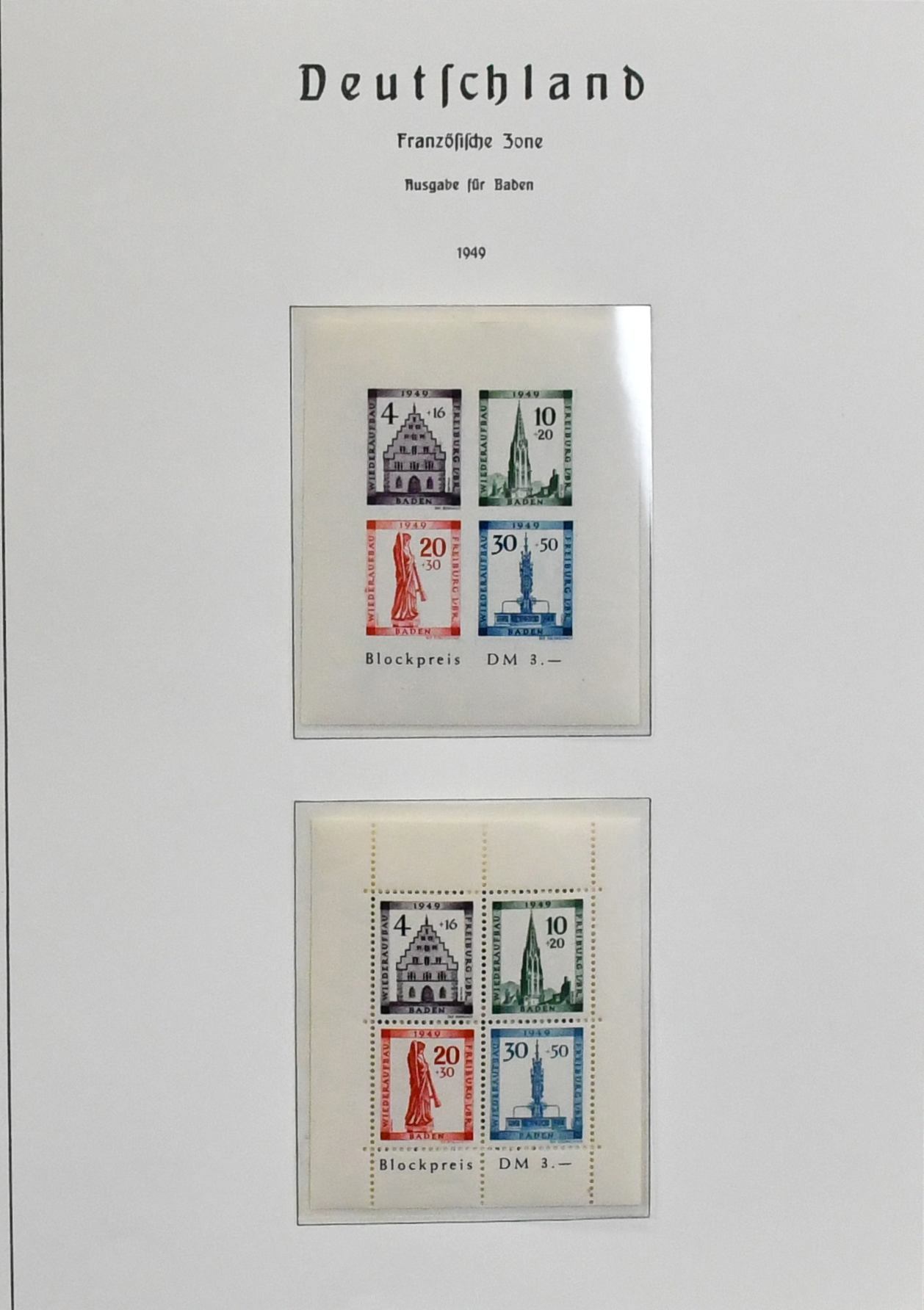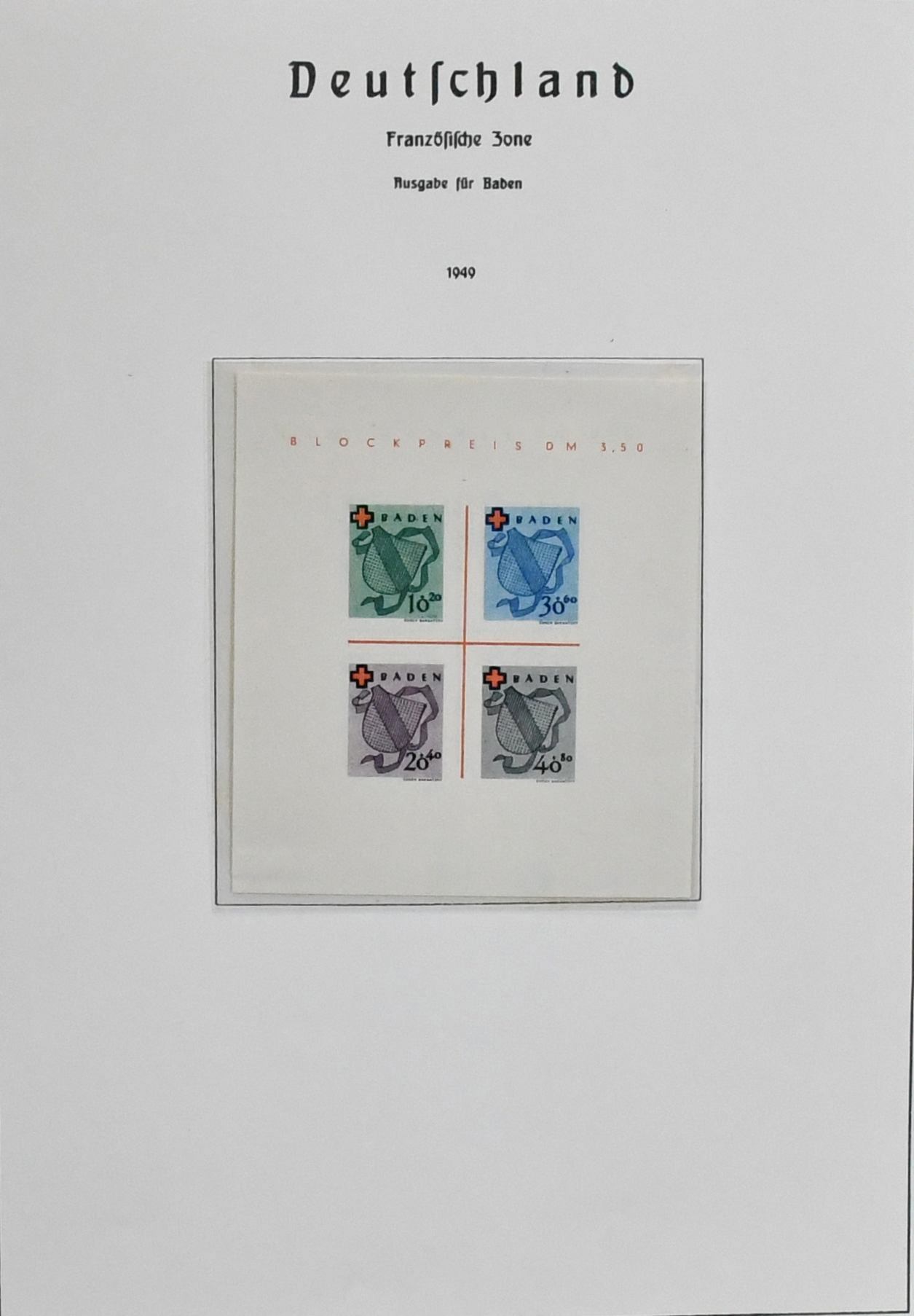 Französische Zone, 1945/49, Slg. aller drei Gebiete, dabei u.a. Baden Nr. 38/45A postfr., zweimal Bl. 1B postfr., guter Block 2II mit rotem SST "Henri Dunant" (Mi. 2800,-), Rheinl.-Pfalz Nr. 32/41 postfr., Württemberg Nr. 28/52 postfr. usw., auf Lindner-Vordrucken