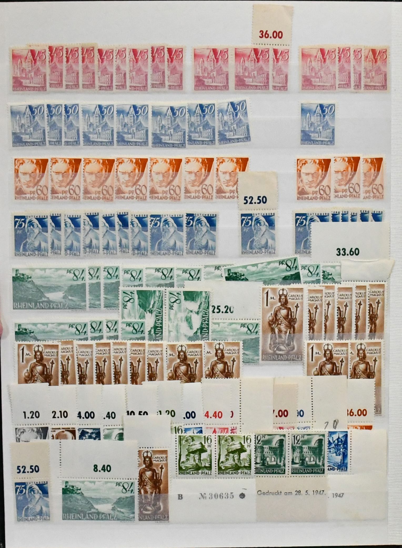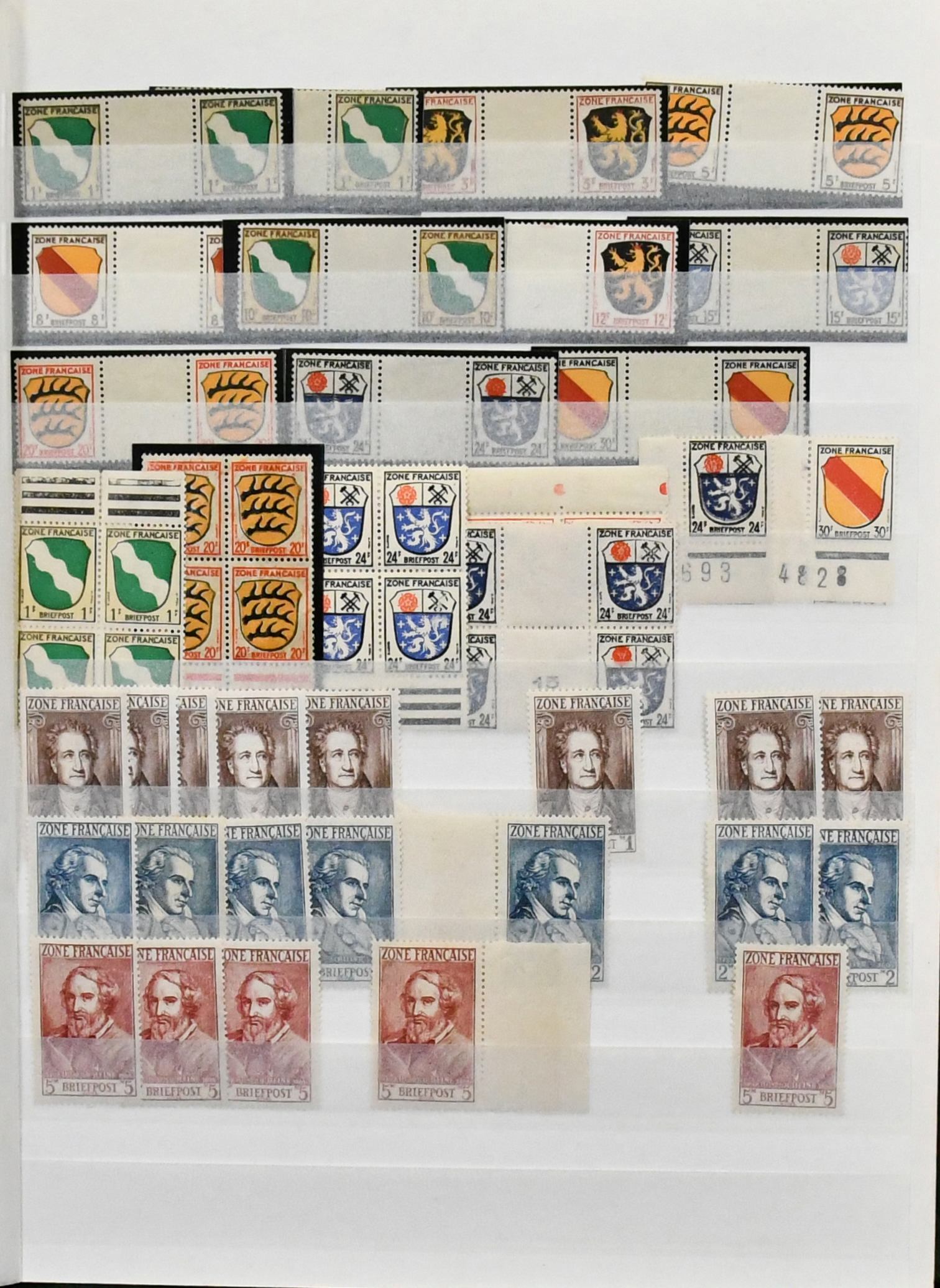 Französische Zone, Partie von etwa 5500 postfr. Werten, fast alle in kompletten Bogen. Dazu einige hundert postfr. Werte Gemeinschaftsausgabe