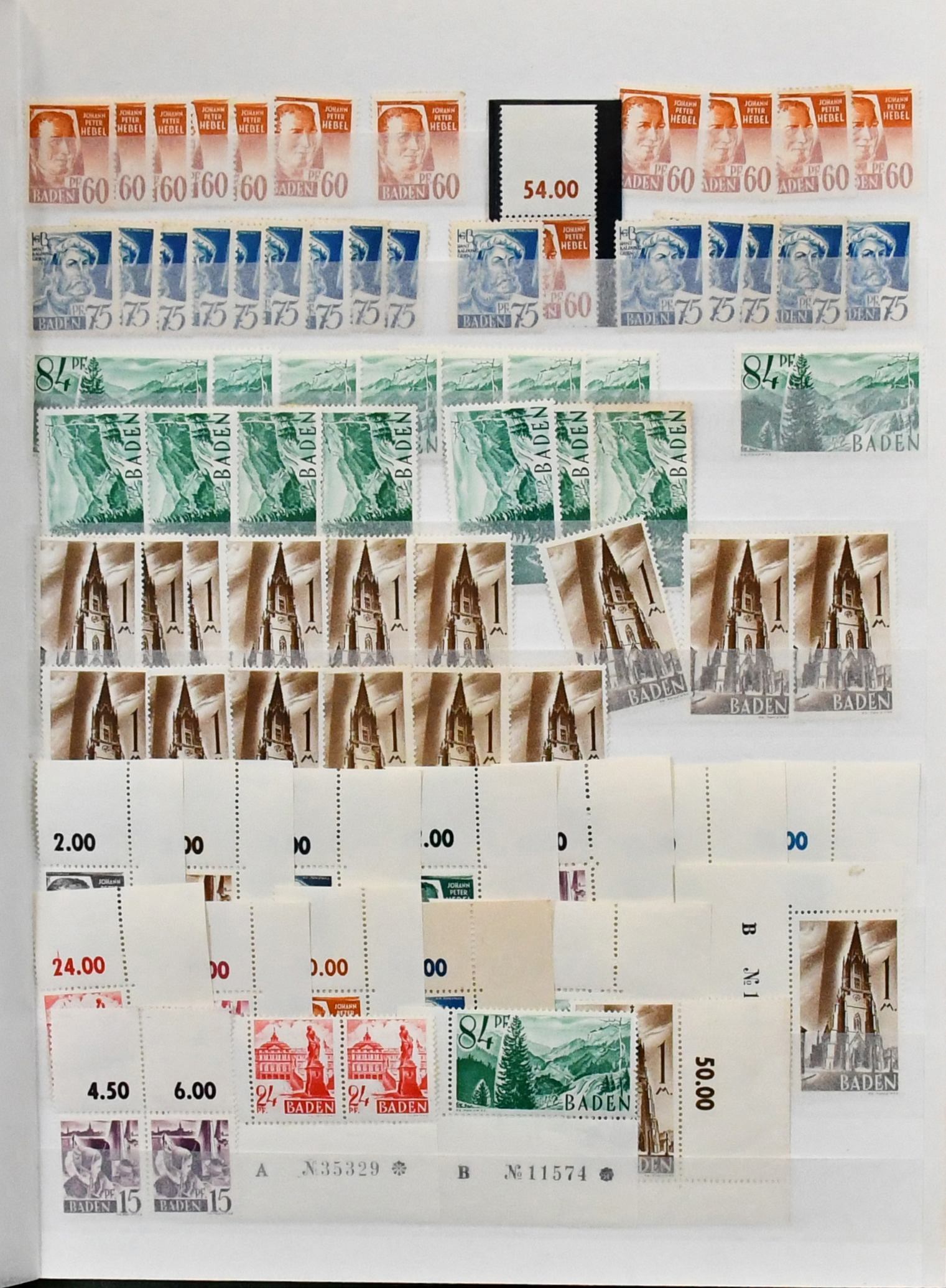 Französische Zone, Freimarken-Ausgaben, postfr. Zusammenstellung mit 23 kpl. Bogen und 400 weiteren Werten lose und in Einheiten. Dabei Leerfelder, u.a. mit Baden Nr. 14 u. 28 je per 20 (Mi. alleine 1200,-), etc.
