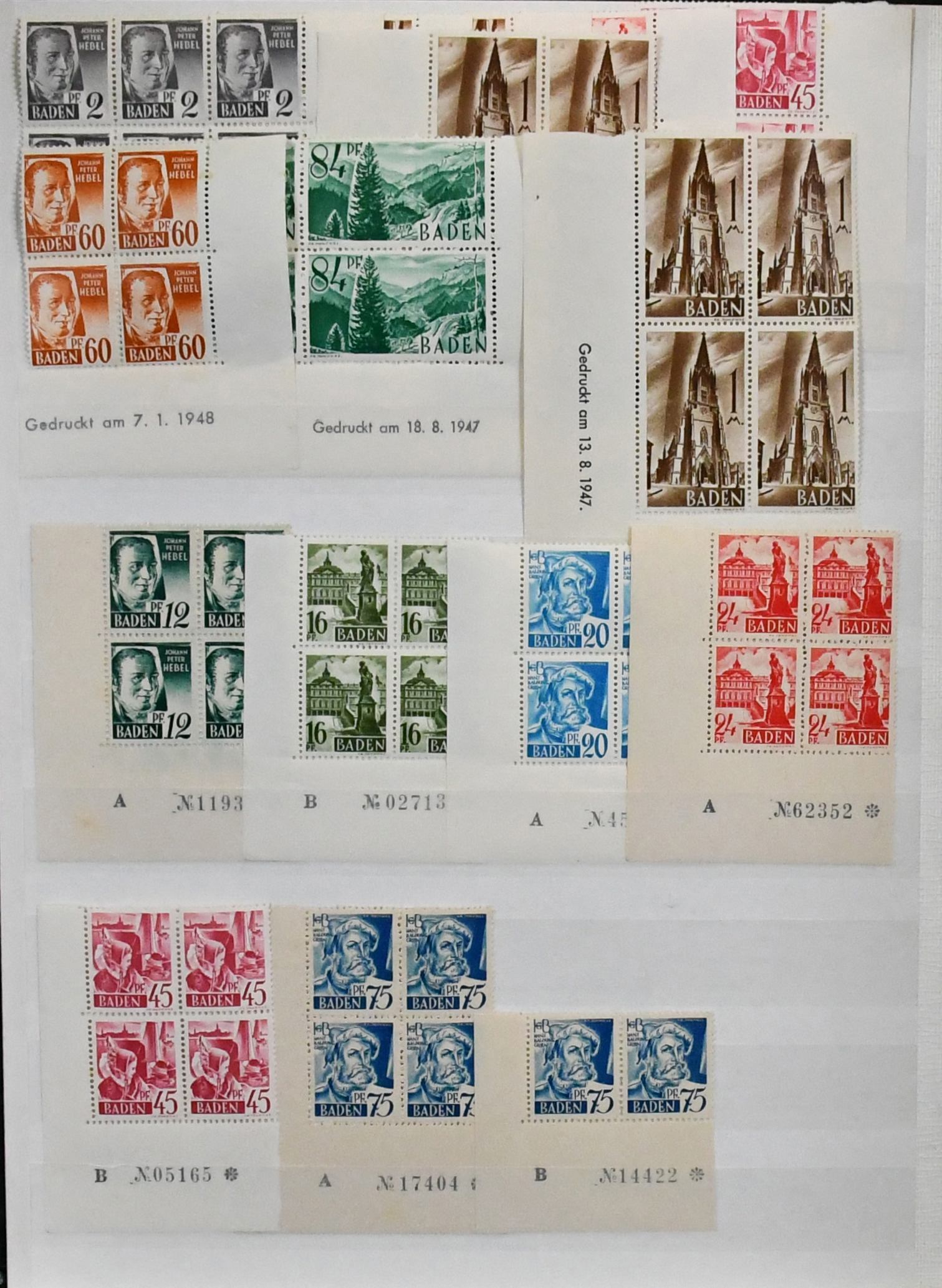 Französische Zone, 1945/49, postfr. und ungebr. Slg. im neuwertigen Sieger-Vordruckalbum. Dabei Baden Nr. 38/41A und Bl. 1A/B postfr. (Mi. 210,-), Nr. 46I fünfmal postfr. (130,-) inkl. einem Bogenecken-Viererblock, Rheinl.-Pfalz (ohne Bl. 1) kpl. usw.
