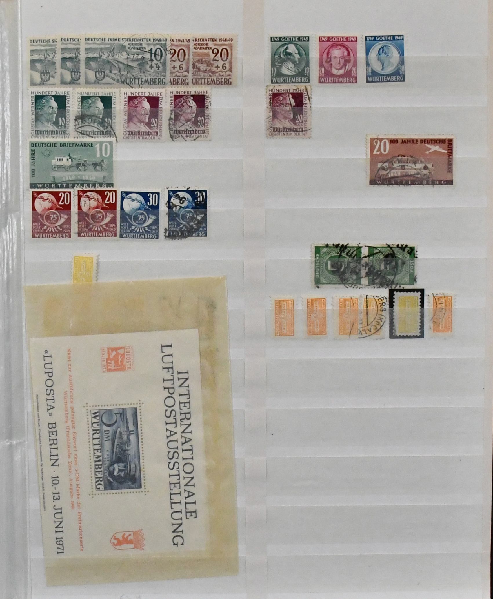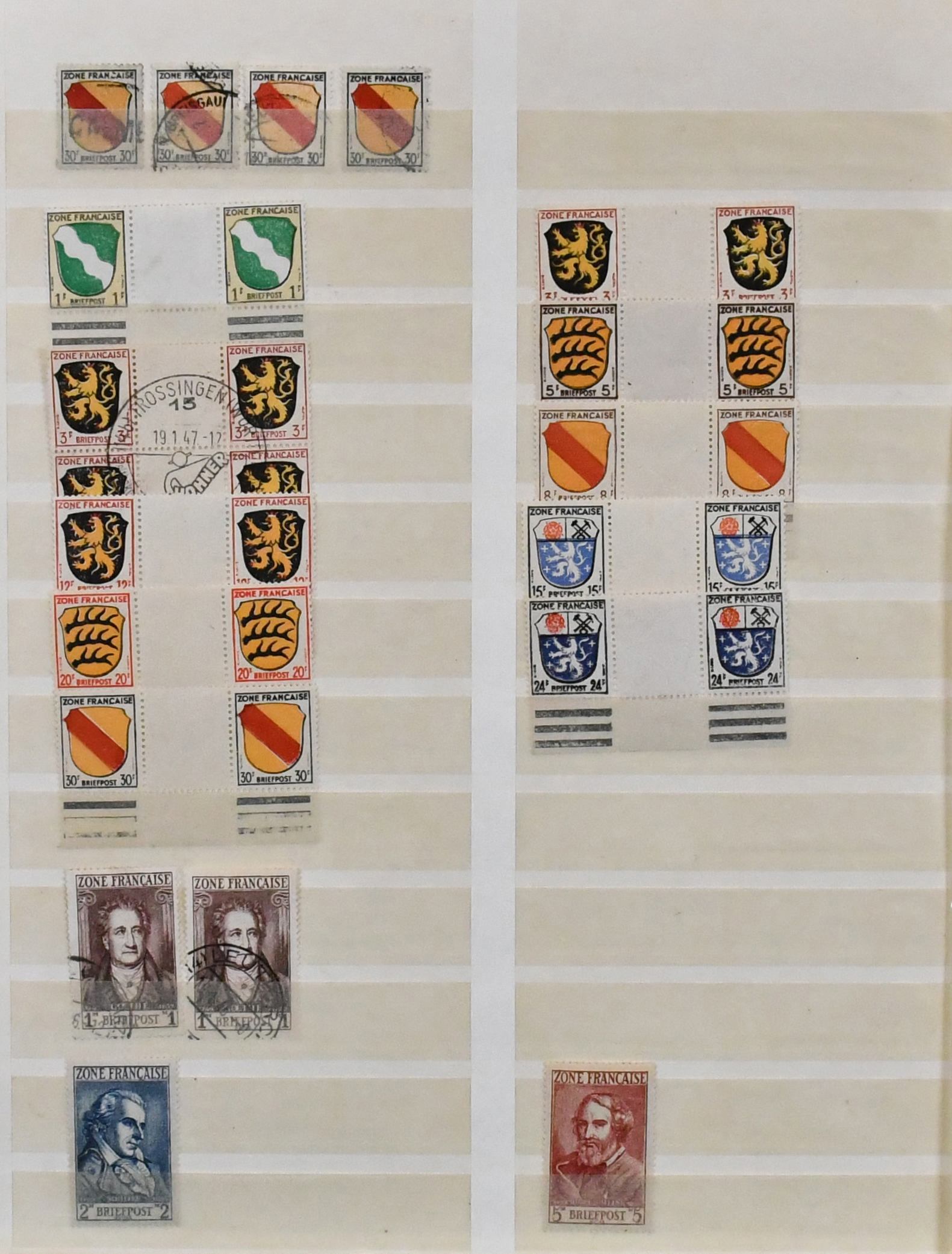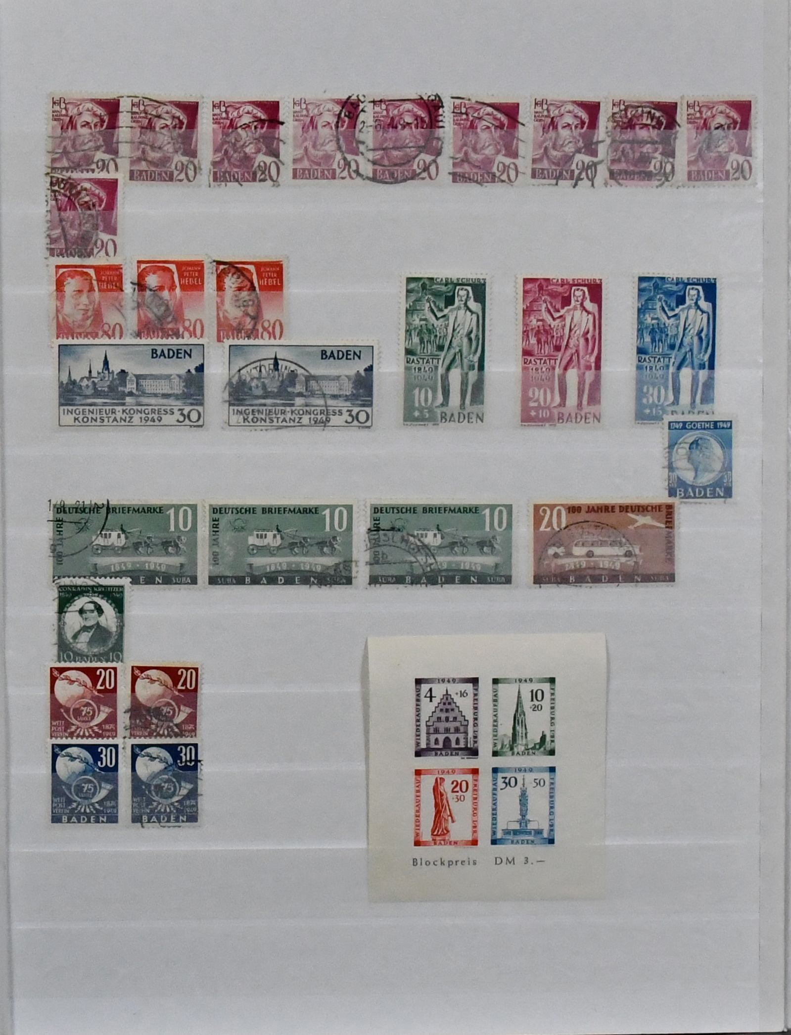 Französische Zone, sortenreiche Zusammenstellung von 1700 Werten, dabei u.a. Baden Bl. 1B, Nr. 46 postfr. u. gest., 47/49 postfr., 53/57 gest., Rheinl.-Pfalz Nr. 46/52, Württemberg Nr. 44/52, teils mehrfach, usw.