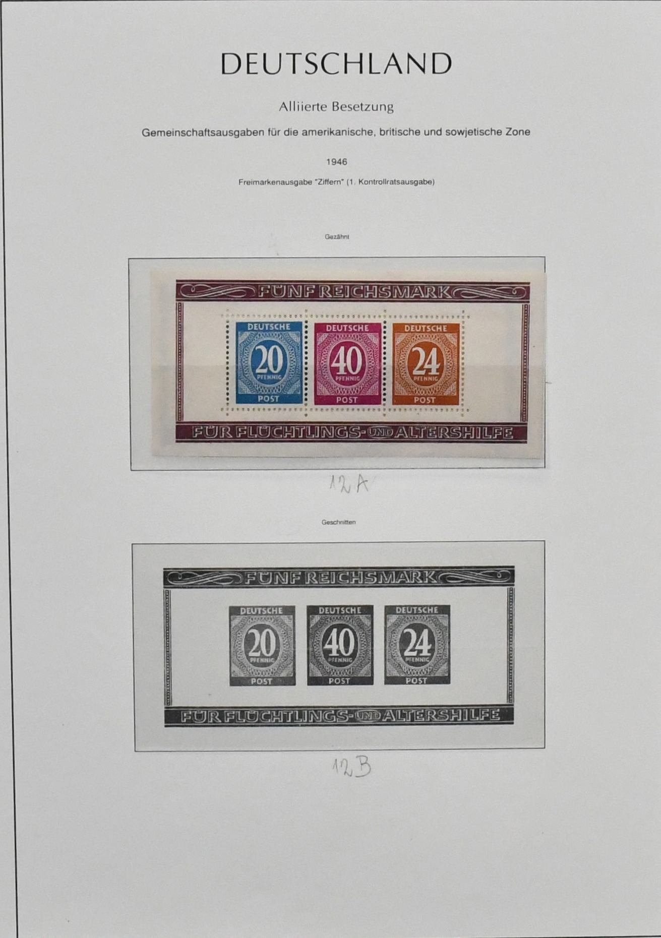 Gemeinschaftsausgabe, 1945/49, gest. kpl. Slg. inkl. Bl. 12A/B mit SST (Mi. 420,-), VZd1 auf Gedenkblatt usw., auf Vordrucken