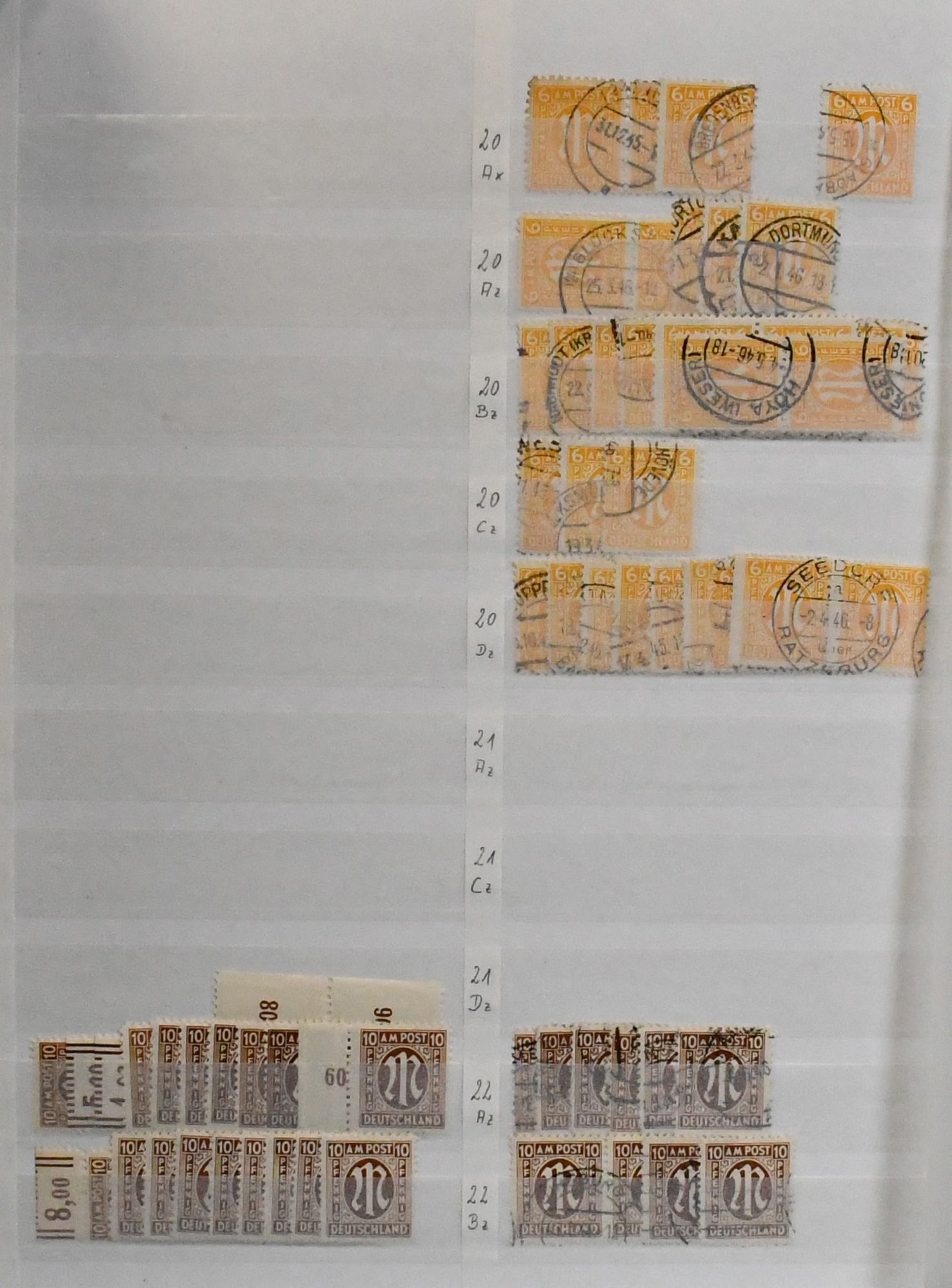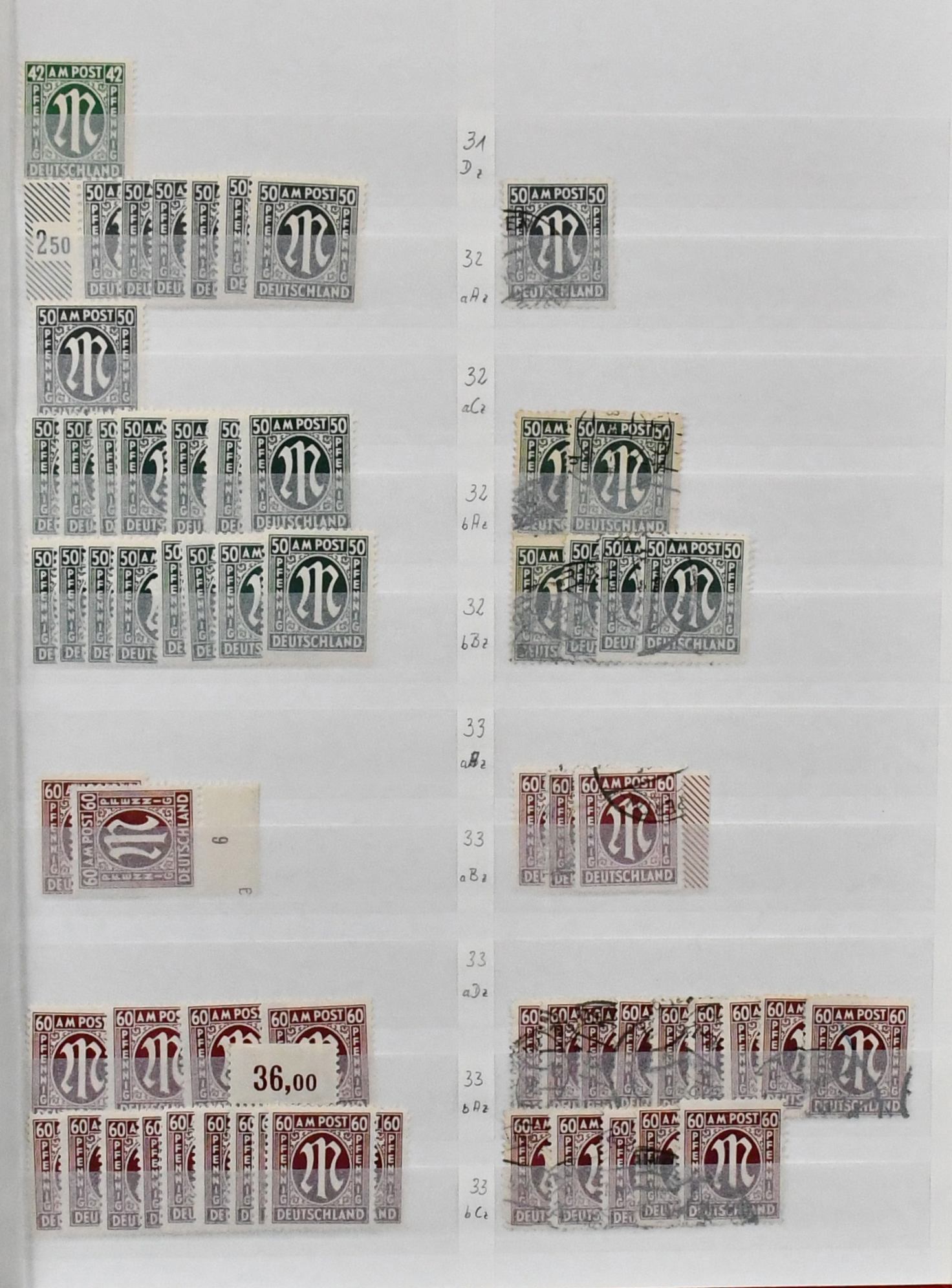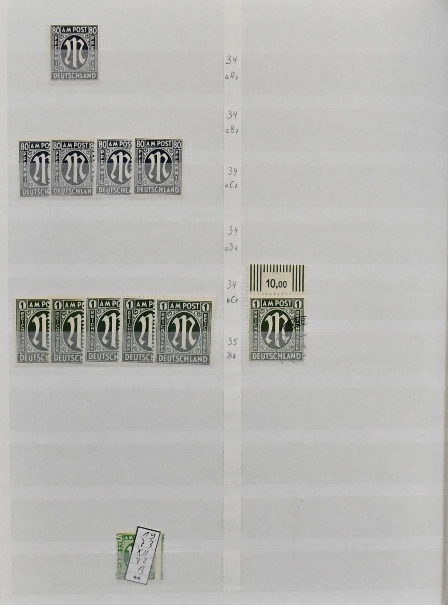 Bizone, 1945/49, gest. Slg. mit AM-Post Nr. 1/35 (Nr. 34/35 unberechnet, da ungeprüft), Nr. 53/55I, gepr. Schlegel BPP (Mi. 162,-), Bauten eg/wg und beiden Typen der Mark-Werte kpl., Nr. 101/10, Bl. 1 mit Ortsstempel (Mi. 350,-) usw.