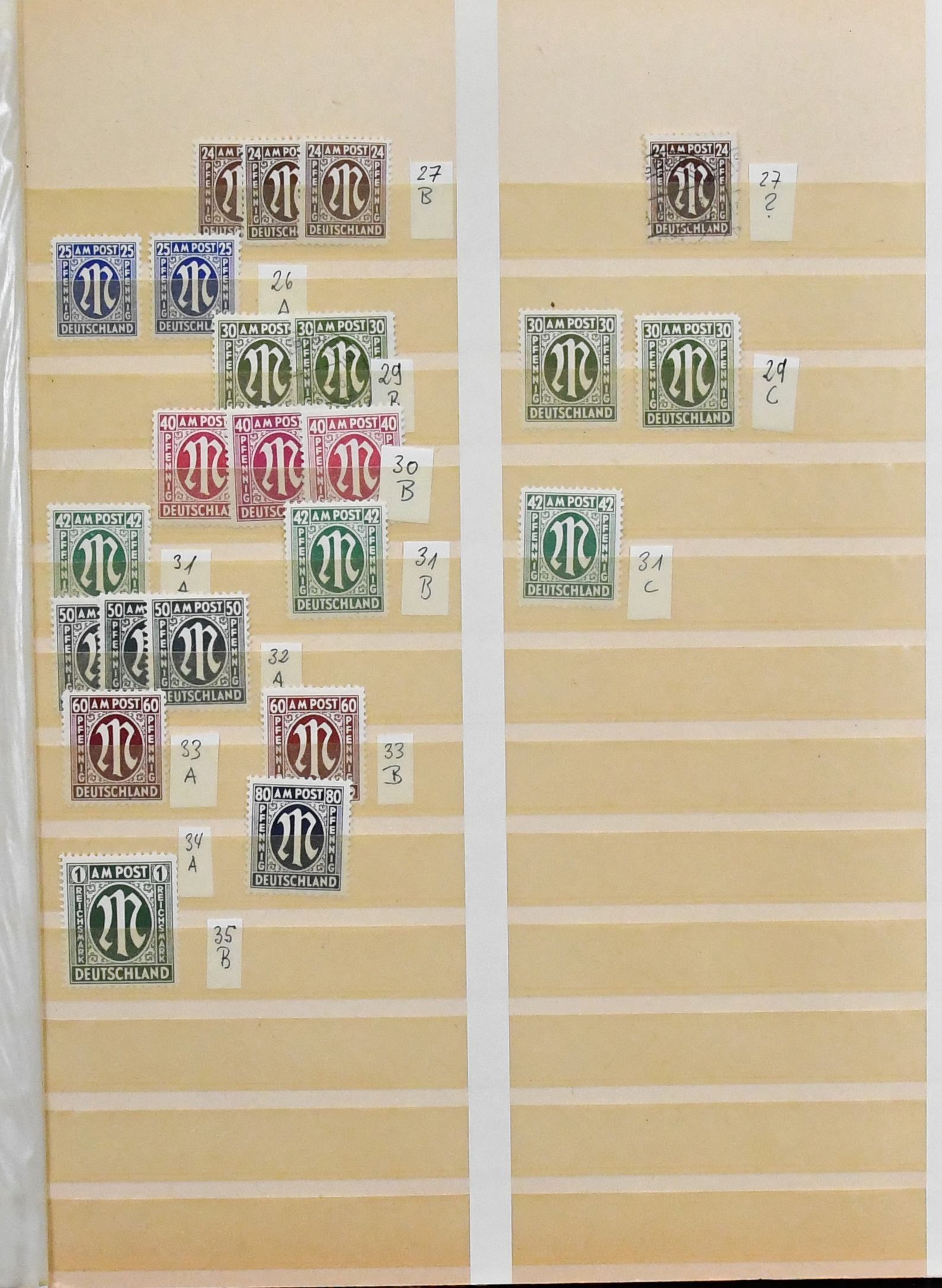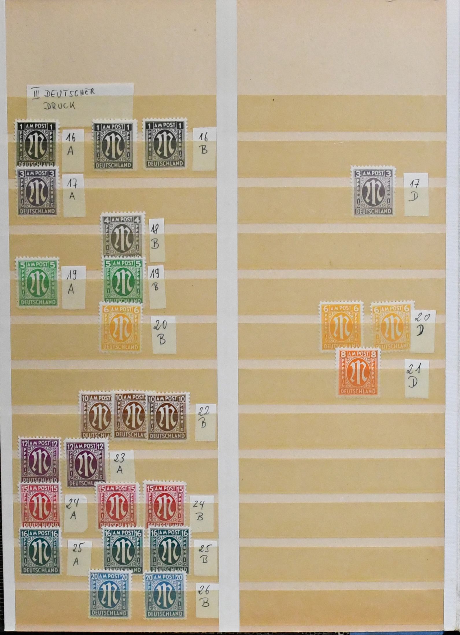 Bizone, 1945/1949, meist postfrische Slg. mit 200 AM-Post-Werten, Aufdruckwerten mit kopfstehenden Aufdrucken, Nr. 37IDDF und 42ID je postfr., gepr. Schlegel BPP (Mi. 300,-), 52/68I, ohne Nr. 60I, teils mehrf. (Mi. 400,-), weiteren, teils besseren Aufdruckwerten, Bauten mit Nr. 77 und Paar Nr. 80 ungezähnt, 96 mit Doppeldruck, 97/100I, 92eg ungebr., 101/10 usw.
