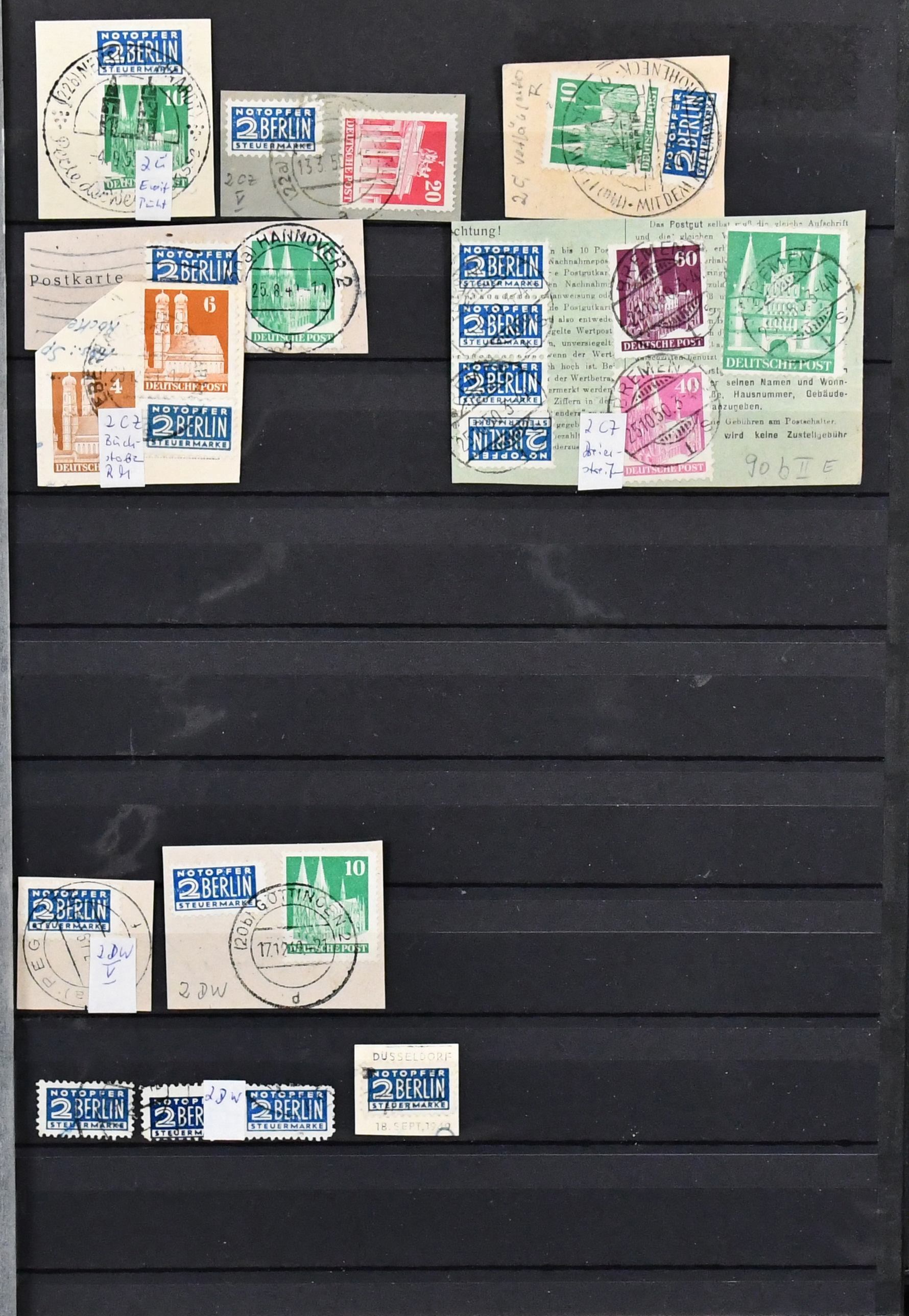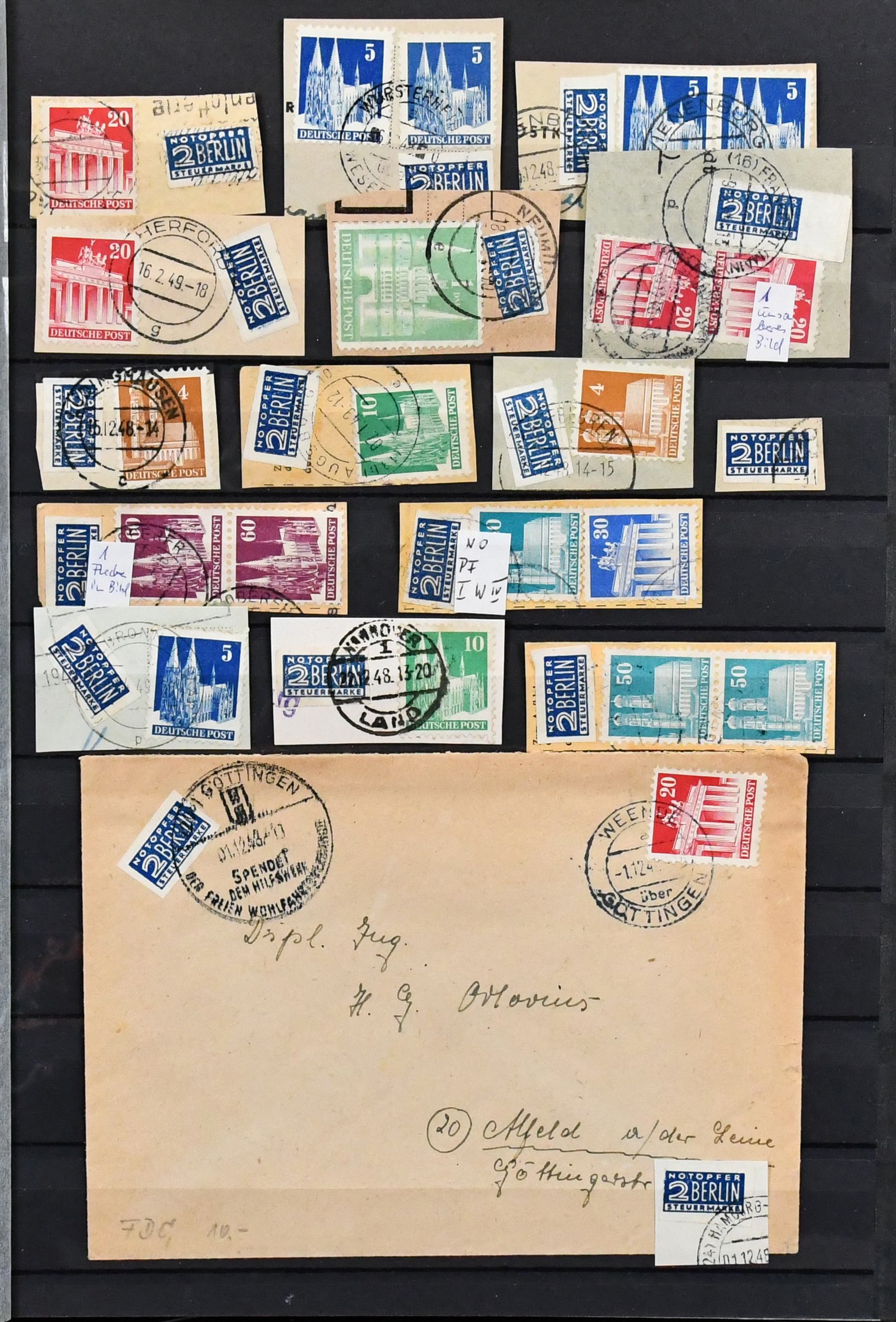 Bizone, Spezialsammlung "Notopfer Berlin" im Album, sehr reichhaltig mit vielen Besonderheiten wie gest. Paare, Leerfelder, Randstücke, Bogenecken usw. Alles vom Sammler genau bestimmt. Dabei auch viele Briefstücke und einige Belege, schönes Objekt