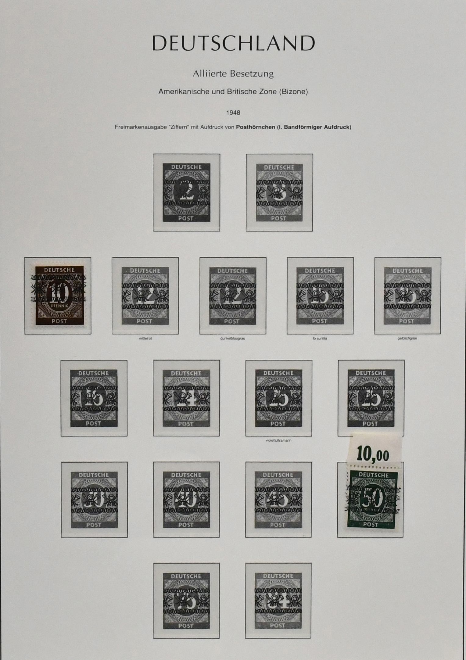 Bizone, Band-/Netzaufdrucke auf Arbeiter-Serie, postfrischer, spezialisierter Sammlungsbestand auf Blättern, neben den Standardserien auch Besonderheiten mit Nr. 49Ia, gepr. Schlegel, 36I Unterrandstreifen mit HAN, gute Oberränder Platte/Walze, z.B. Nr. 41IIdgz, 46IIdgz, 40I Platte Ecke 1 mit DZ "positive 1" etc.