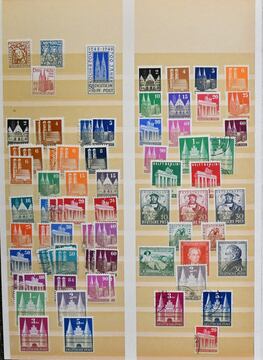 Bizone, 1945/1949, gest. Slg. ab AM-Post, mit Nr. 36/51I/II (Mi. 400,-), inkl. Nr. 49I, Bauten eg, wg und beiden Typen der Mark-Werte, Nr. 101/10, Bl. 1 mit Ortsstempel (Mi. 350,-), Einzelwerte aus Bl. 1 mit anhängenden Blockrändern inkl. 10 Pfg. per zwei (Mi. 240,-), Nr. 101/10 usw.