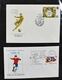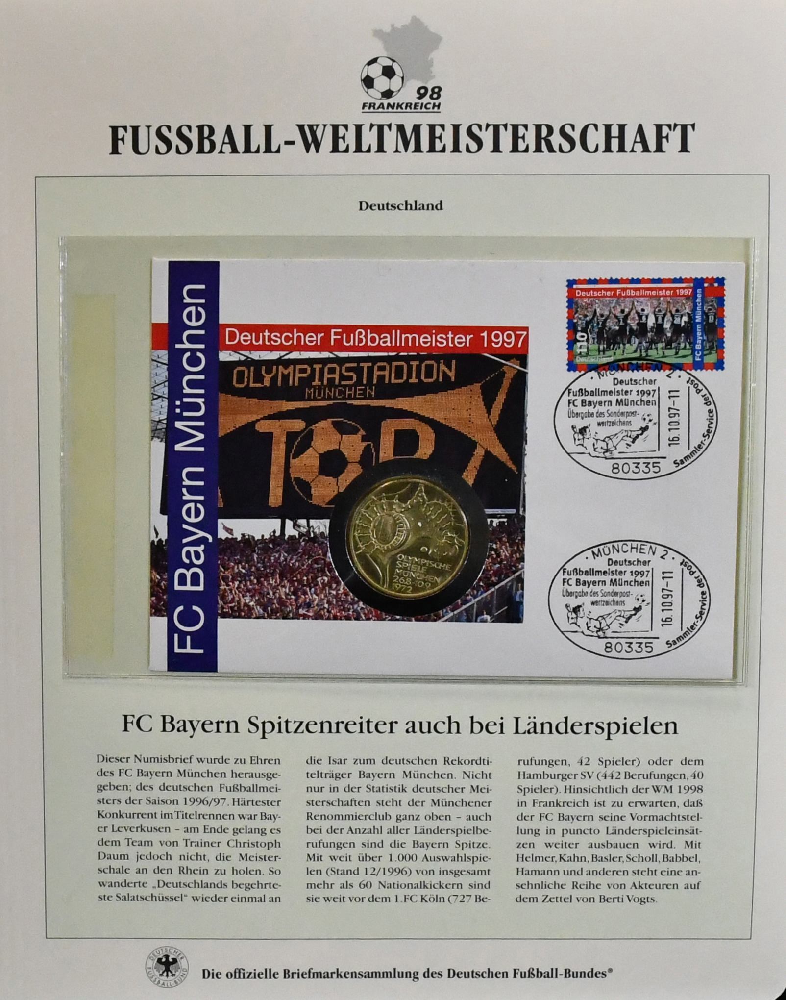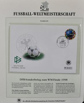 Fußball-Weltmeisterschaft 1998 in Frankreich, postfrische, mit vielen Briefen aufgelockerte Slg., mit fast 40 Blöcken und Kleinbögen etc., im neuwertigen Borek-Vordruckalbum