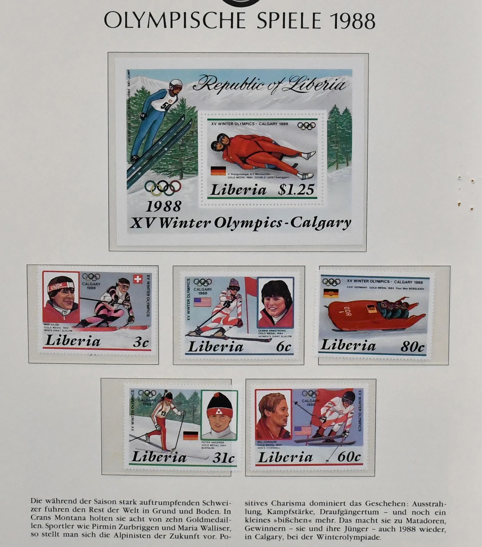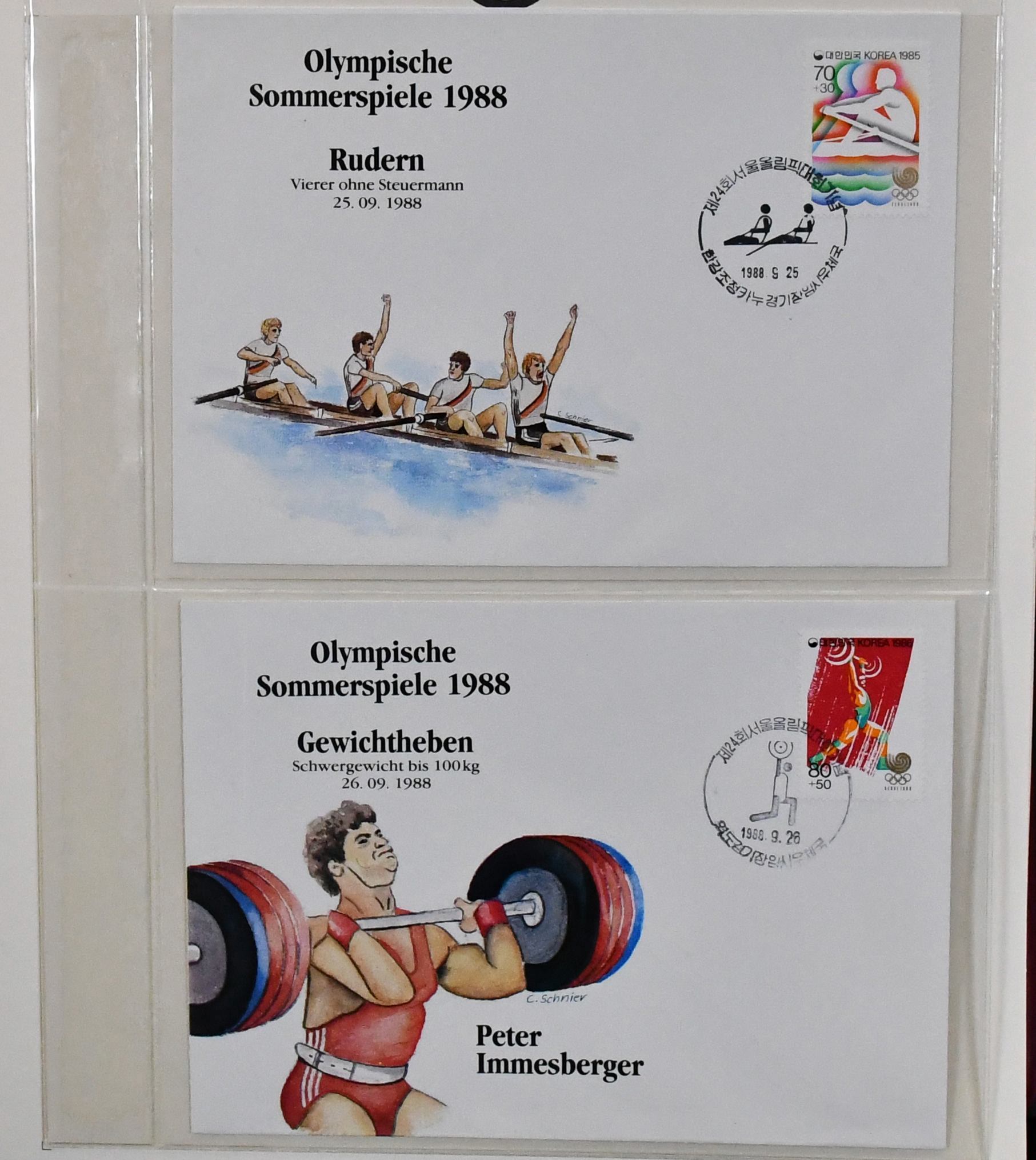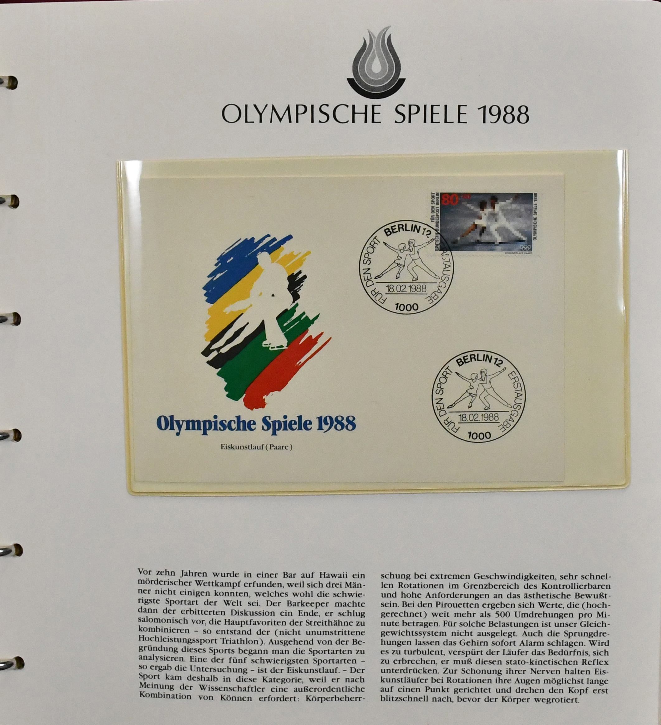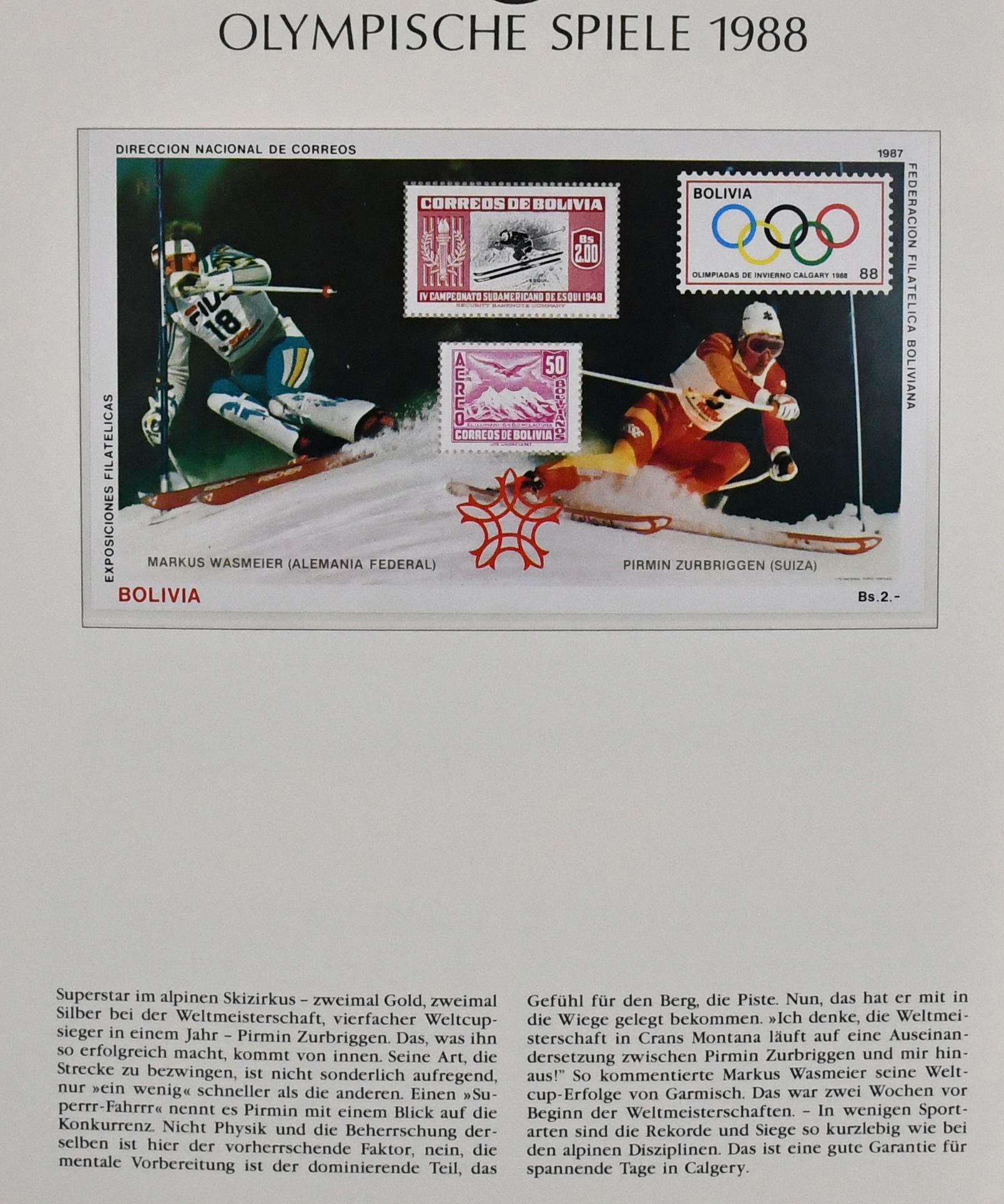 Olympische Spiele 1988, Borek-Abo-Sammlung auf 286 Vordrucken in drei Borek-Ringbindern, dabei u.a. Sowjetunion postfr. Kleinbogensatz (Nr. 5788/5792, Mi. 550,-), viel Übersee, sowie fünf Numisbriefe