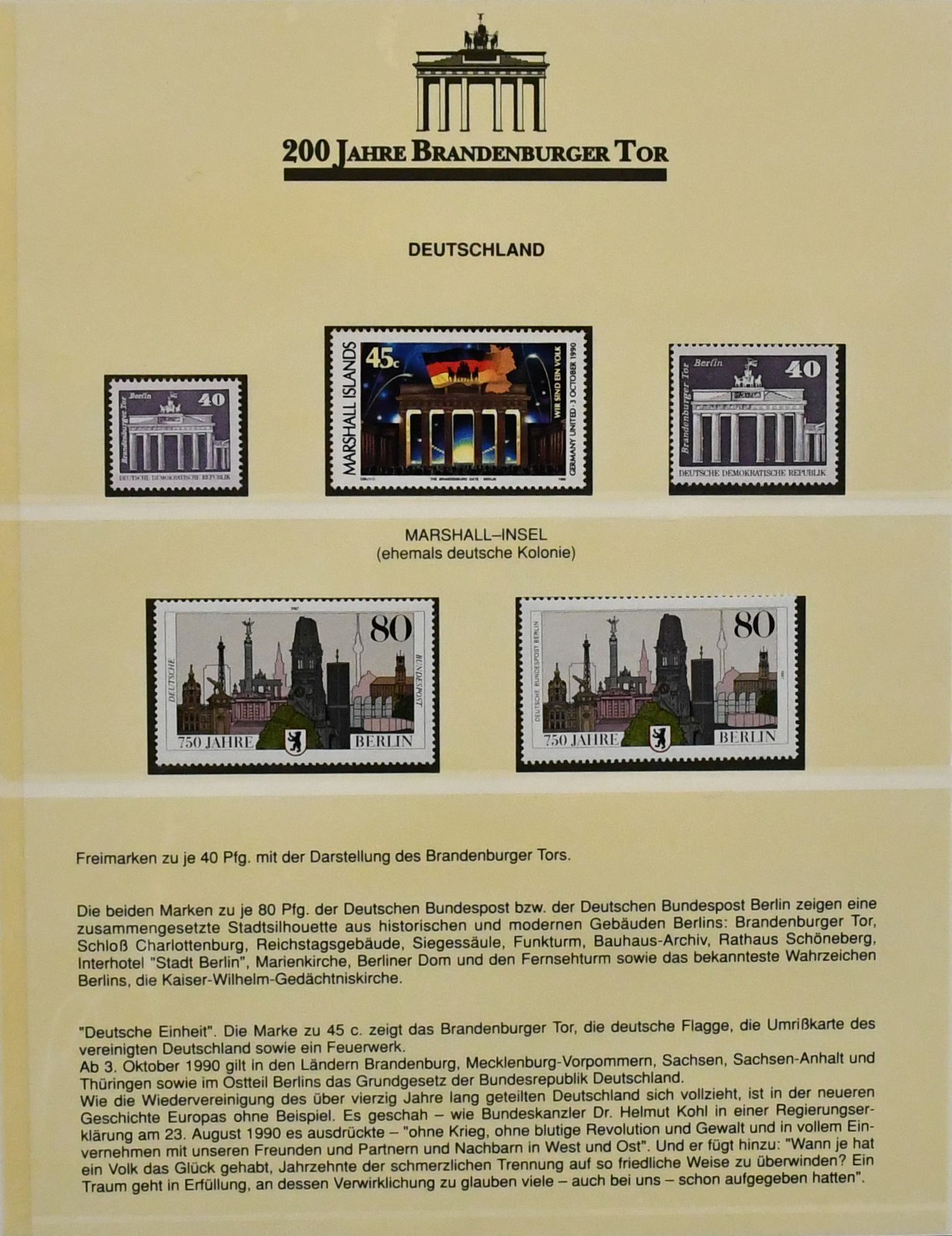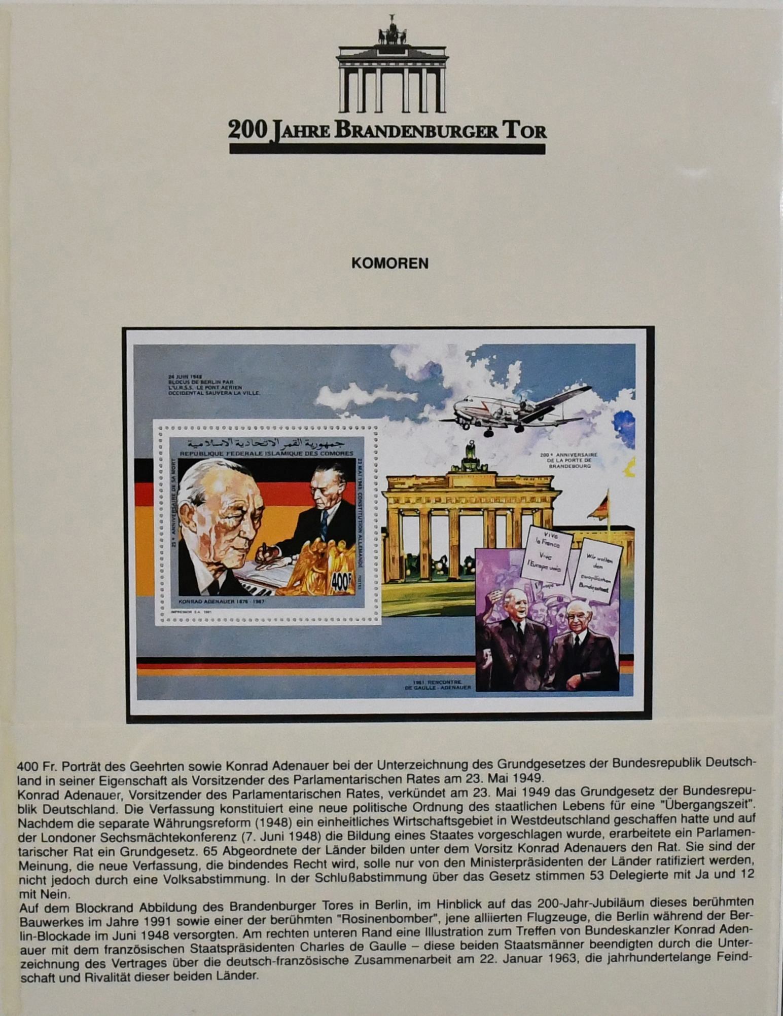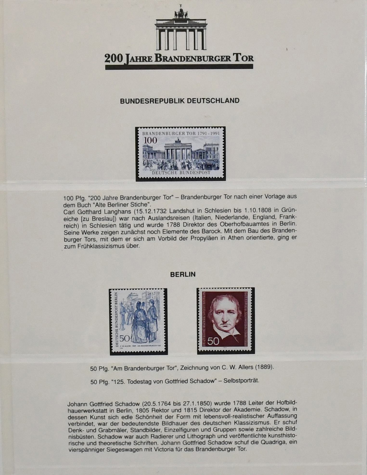 "200 Jahre Brandenburger Tor", Sieger-Abo-Sammlung auf 79 Vordrucken in zwei Lindner-Ringbindern, dabei postfr. Ausgaben und Belege aus aller Welt, sowie Medaille
