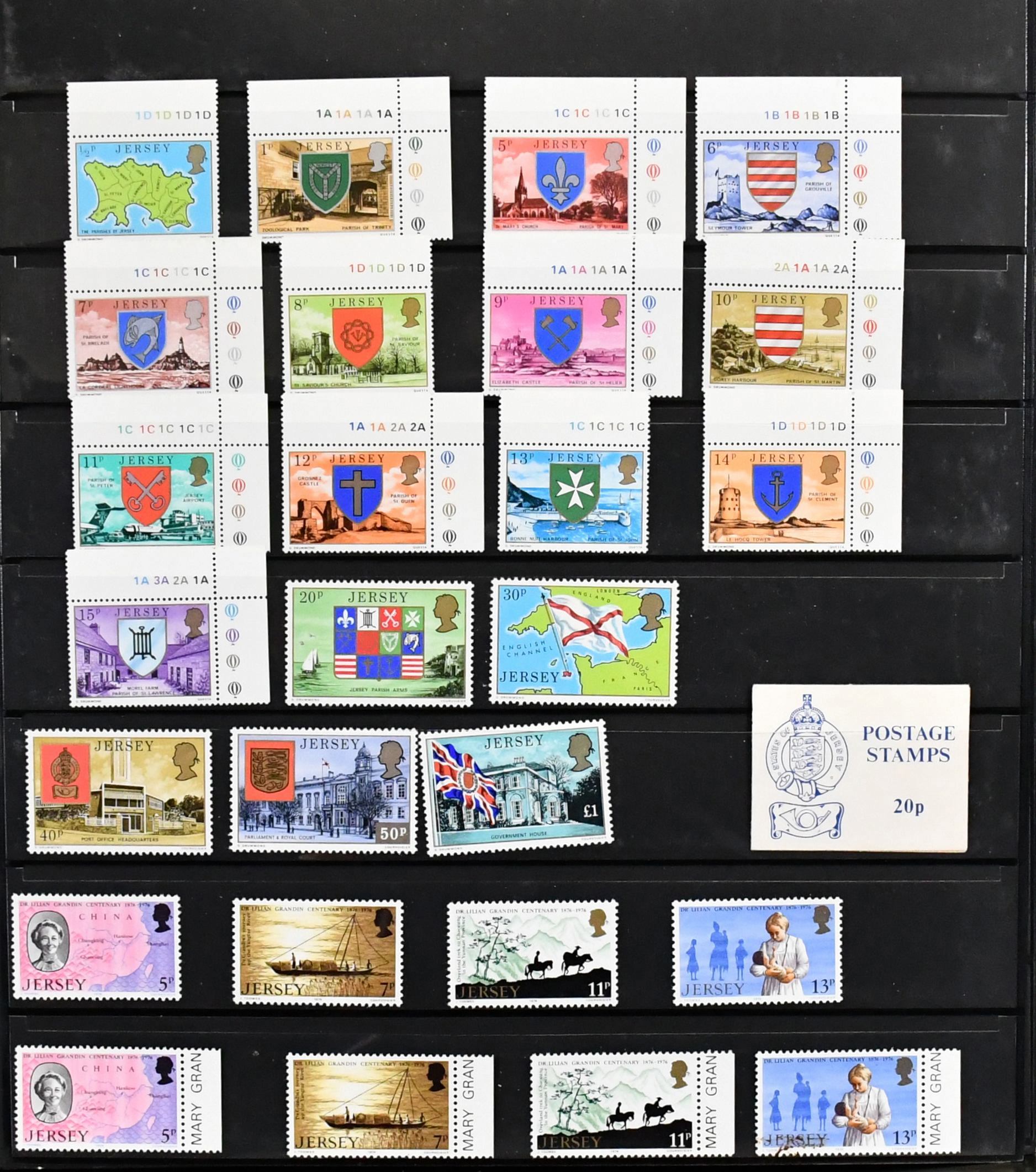 Jersey, postfrische, von 1958-1998 komplette Sammlung, zusätzlich diverse Markenheftchen, ferner Deutsche Bes. II. Wk. Jersey Nr. 1/8. Mi. 1100,-