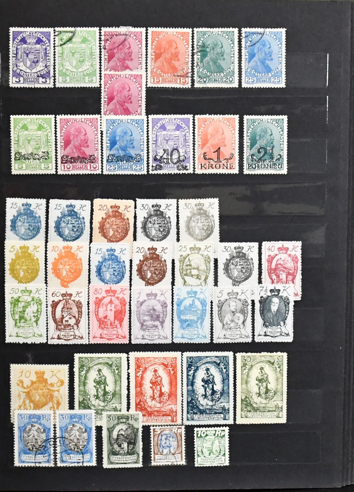 Liechtenstein, 1917-1928, Posten mit guter Satzware, postfr./Falz/gest., u.a. Nr. 11/16, 72/74 (dreimal gest.), 75-77 (siebenmal gest.), 78/81, dazu Block 2, sowie ein Steckbuch mit modernem Sammlungsteil