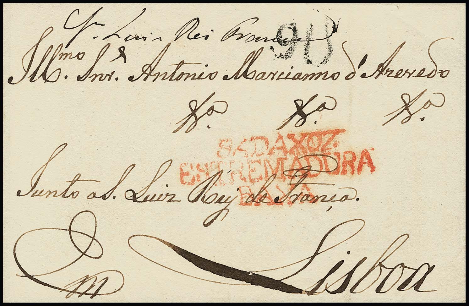 "Spanien-Portugal", (1820), Faltbrief aus Badajoz (roter L3) an den Vertreter des französischen Königs in Lissabon, hs. Portofreiheitsvermerk "fr. Luis Rei France"
