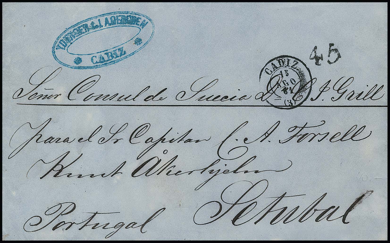"Spanien-Portugal", 1845, Faltbrief von Cadiz mit rotem K2 nach Lissabon, blauer Ra1 "Franca" und Taxstpl. "90", dazu Brief von Cadiz 1861 nach Setubal an einen Schiffskapitän