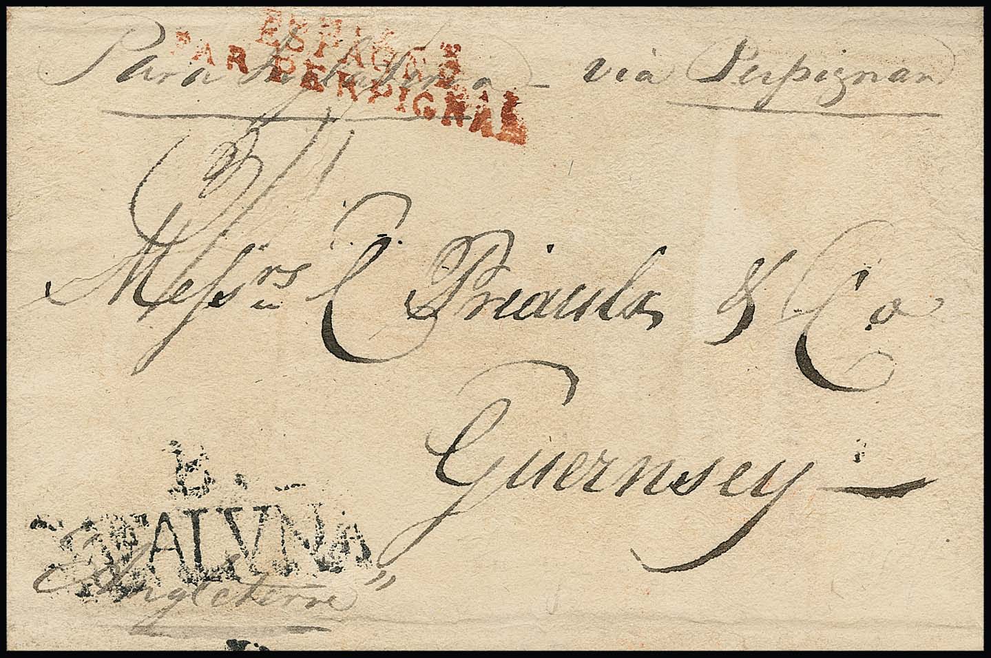 "Spanien-Kanalinseln", 1815, früher Brief mit Aufgabe-L2 und rotem L2 "Espagne par Perpignan" nach Guernsey, aus der Zeit der Rückkehr Napoleons von Elba