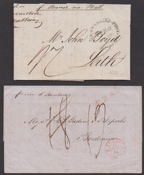 "Schiffsbriefpost Hamburg", Einkreiser rs. auf Brief von Porto Cabello/Venezuela 1844 via Hamburg (!) nach Frankreich, sowie vs. auf Brief 1837 von Copenhagen nach England