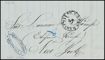 "Kolumbien-USA" per Norddeutschem Lloyd, 1873, Brief von Barranquilla nach New York, innen hs. "p.v.p. Frankfurt via Colon", befördert mit Deutschem Dampfer "Frankfurt" und direkt am Schiff aufgegeben, deshalb Taxe "0" und "10 C." für USA-Inland
