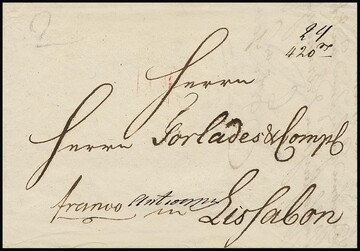 "Preußen-Portugal", 1799, früher Brief aus Stralsund mit ungewöhnlichem Laufweg "franco antwerpen" nach Lissabon, hs. Taxe "420" Reales