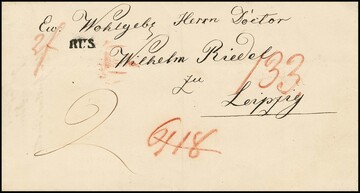 "Rus", seltener Transit-L1 (Feuser nicht gelistet) auf Faltbrief 1843 mit kpl. Inhalt aus Odessa nach Leipzig