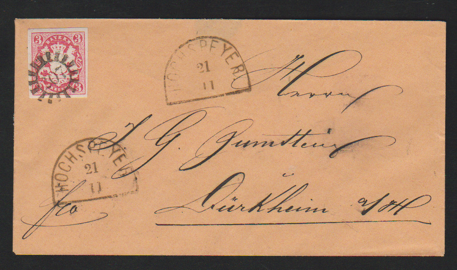 "207", gMR nebst HK "Hochspeyer" auf beigem Kabinettcouvert mit 3 Kr.