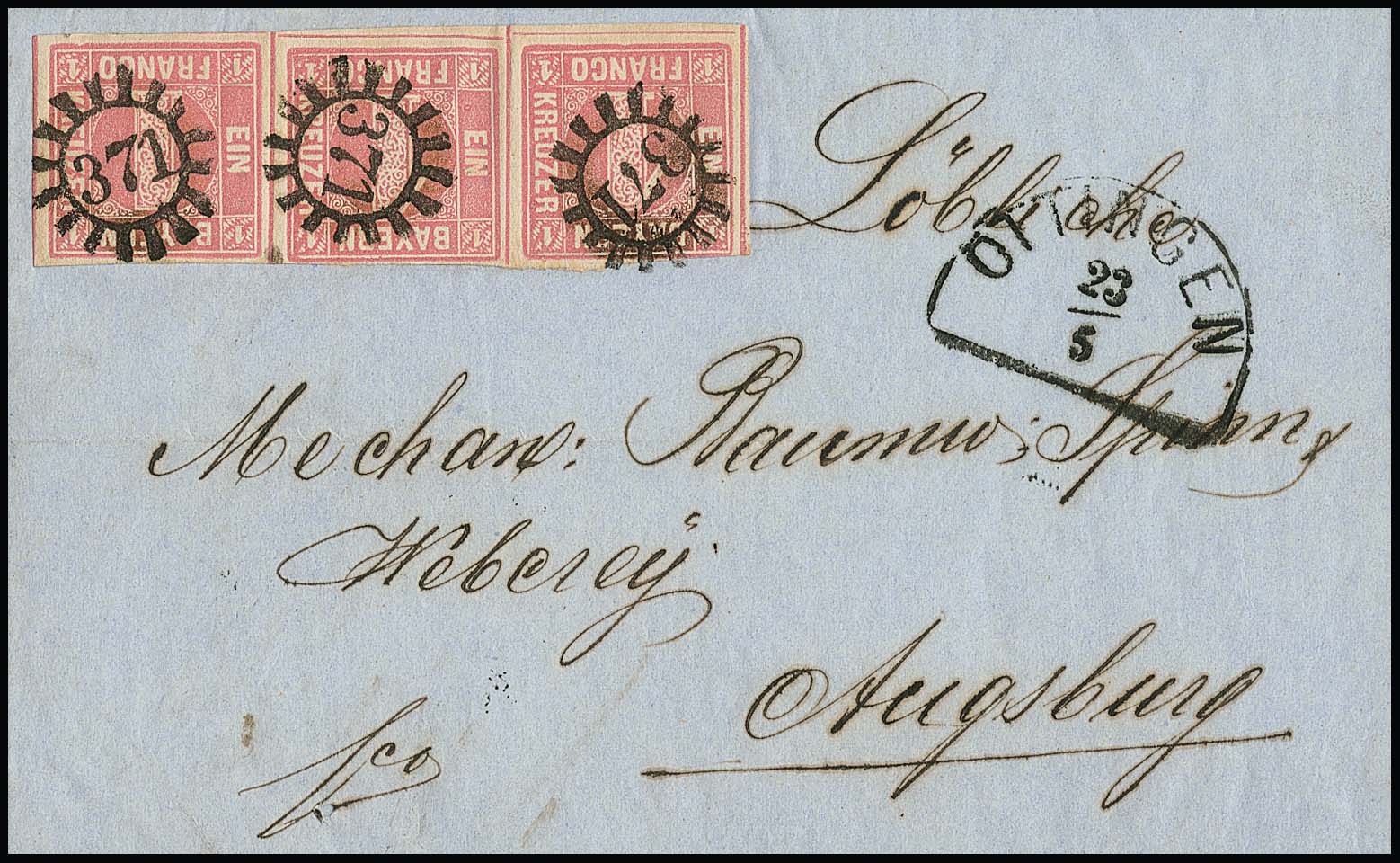"371", gMR nebst HK "Öttingen" auf Brief mit waager. Dreierstreifen 1 Kr. rosa, rechte Marke oben winzig berührt