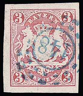 "148" (Gangkofen), oMR in blau klar zentrisch auf breitrandigem Prachtstück 3 Kr. (rs. min. Verfärbung)