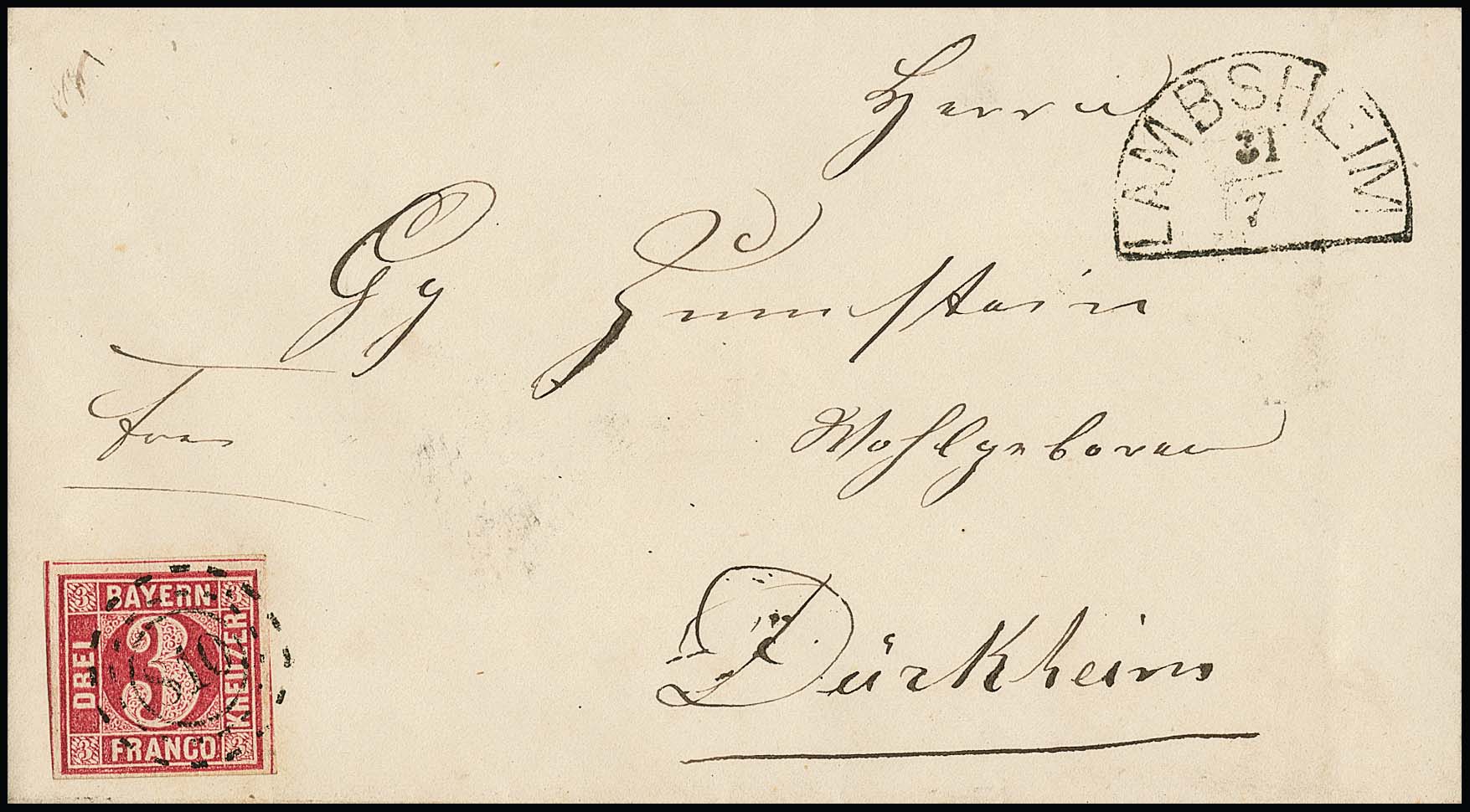 "617", oMR als Vorausentwertung (oben noch Stempel-Schaufelteile eines weiteren oMR, dadurch und durch fehlenden Stempeldurchschlag als VE bestimmbar), HK "Scheinfeld" nebengesetzt, auf Brief (unten Mitte Riß) mit perfekter 3 Kr. blau, Attest Brettl. VE von Scheinfeld sind selten!