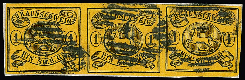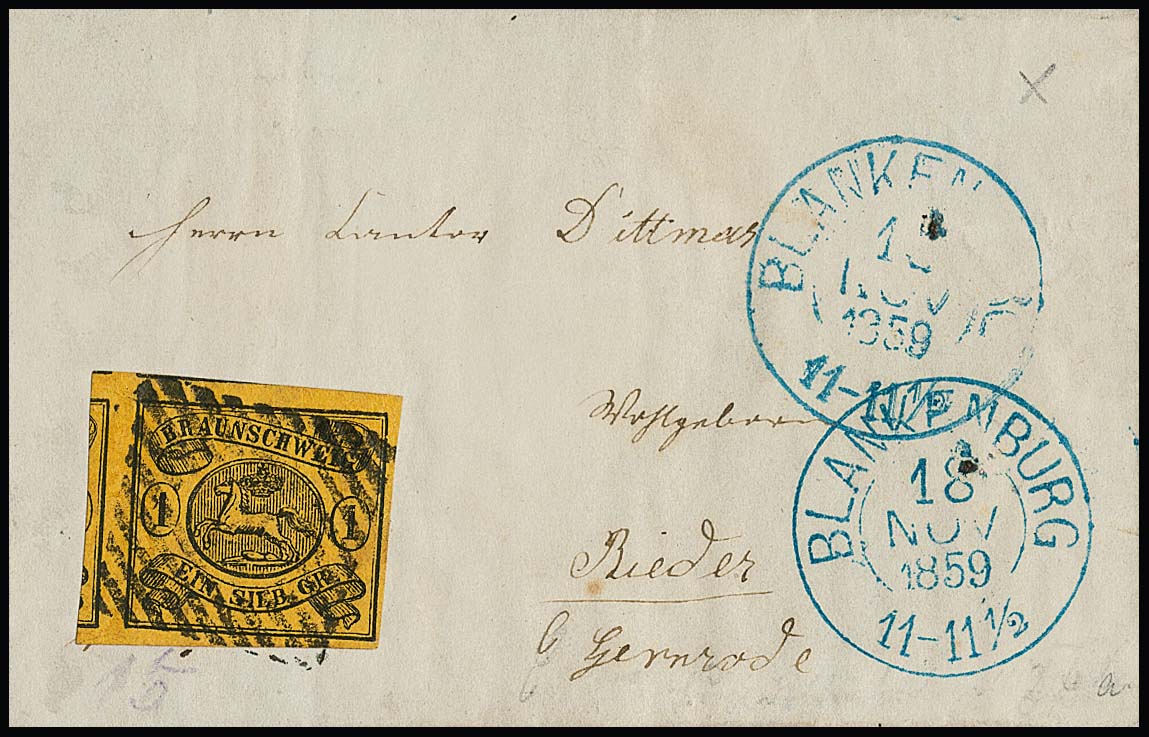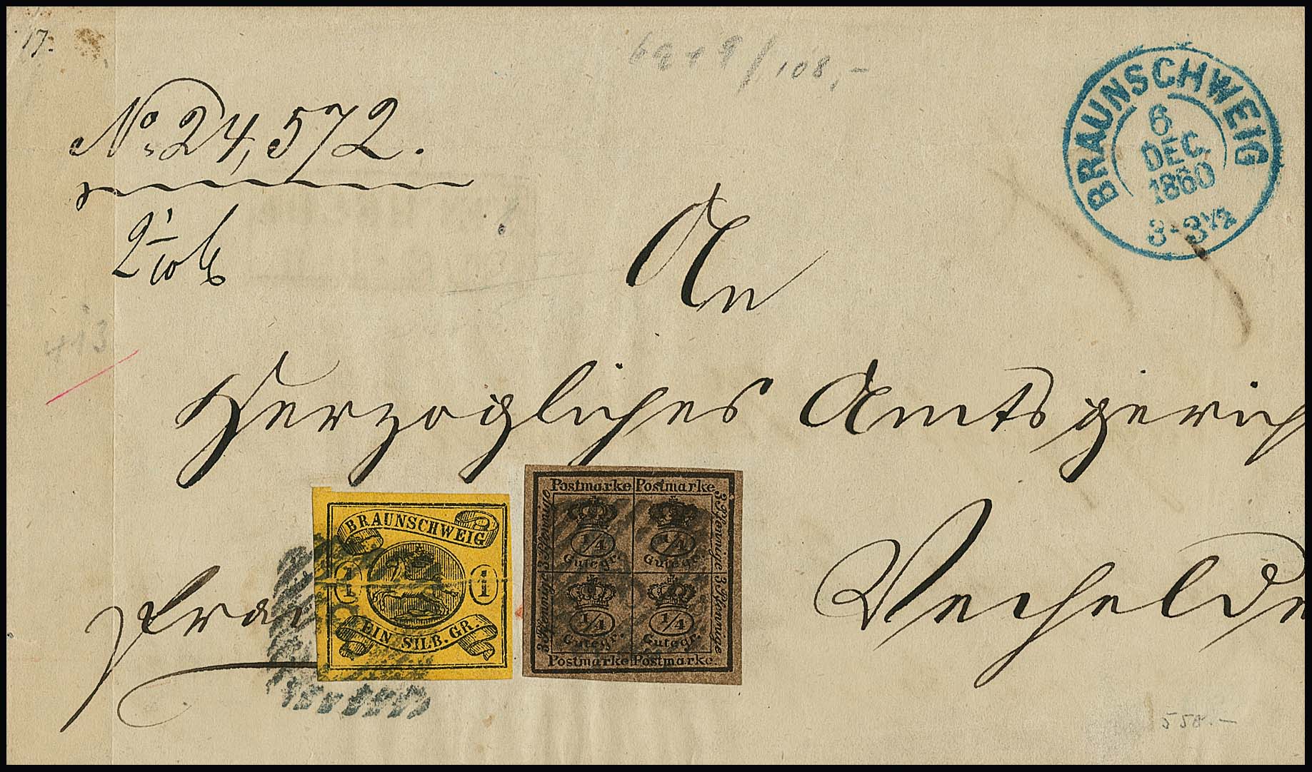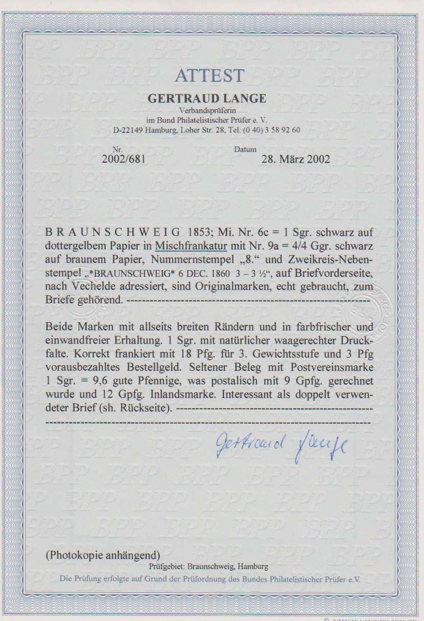 1 Sgr. schw./braungelb mit extremer, herstellungsbedingter Quetschfalte, in Mischfrankatur mit 4/4 Ggr. schw./braun, je Kabinettstücke auf doppelt verwendeter Inlands-Briefvs. der 3. Gewichtsstufe von Braunschweig 1860 nach Vechelde. Seltene Währungs-Mischfrankatur (mit 3 Pfg. vorausbezahltem Bestellgeld). Attest Lange