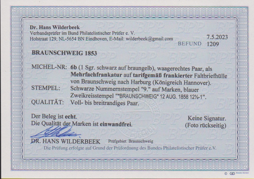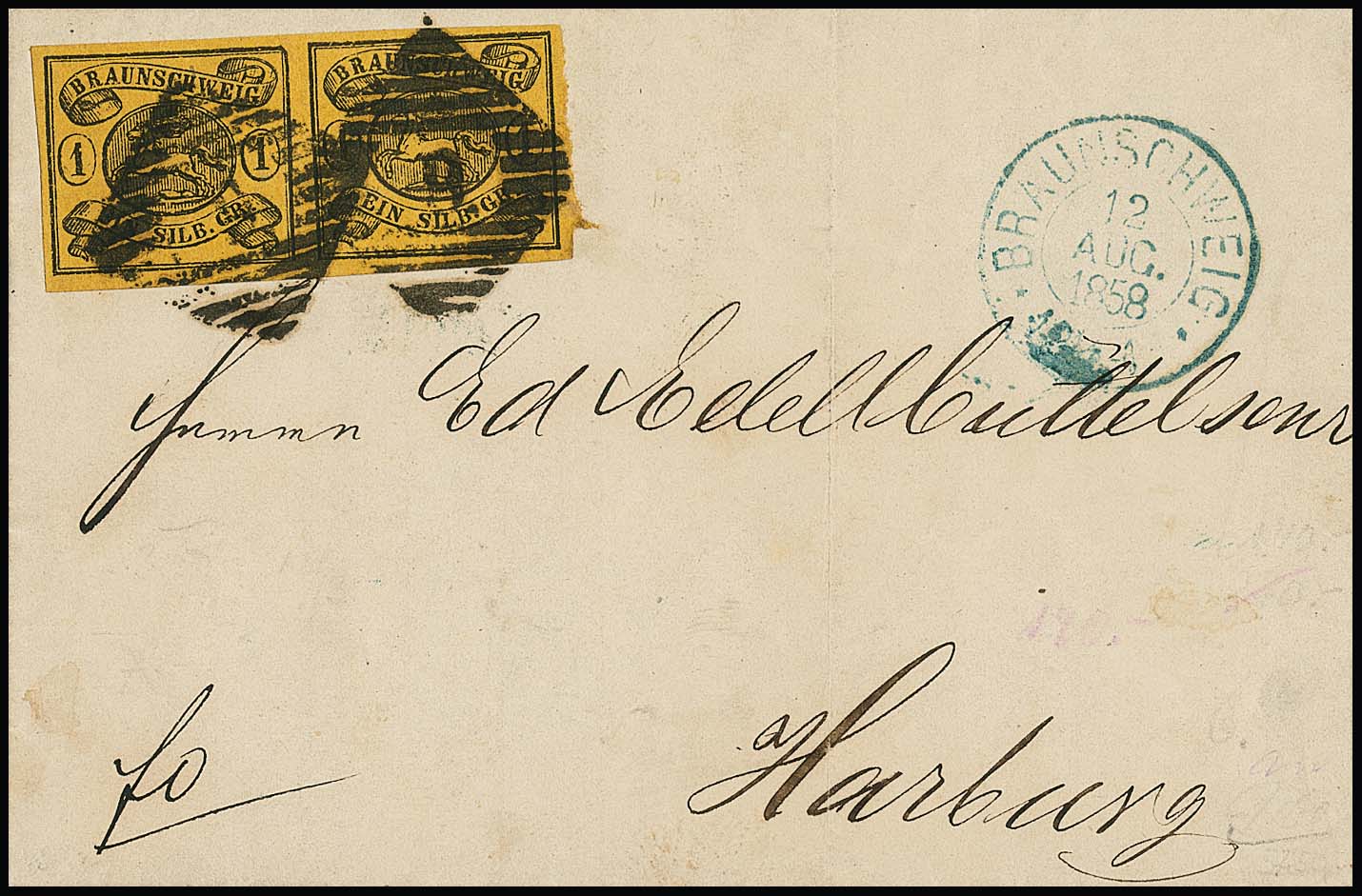 1 Sgr. schw./braungelb im Paar auf Kabinettbrief mit NS "9" und K2 "Braunschweig" 1858 nach Harburg, Fotoexp. Wilderbeek