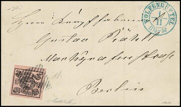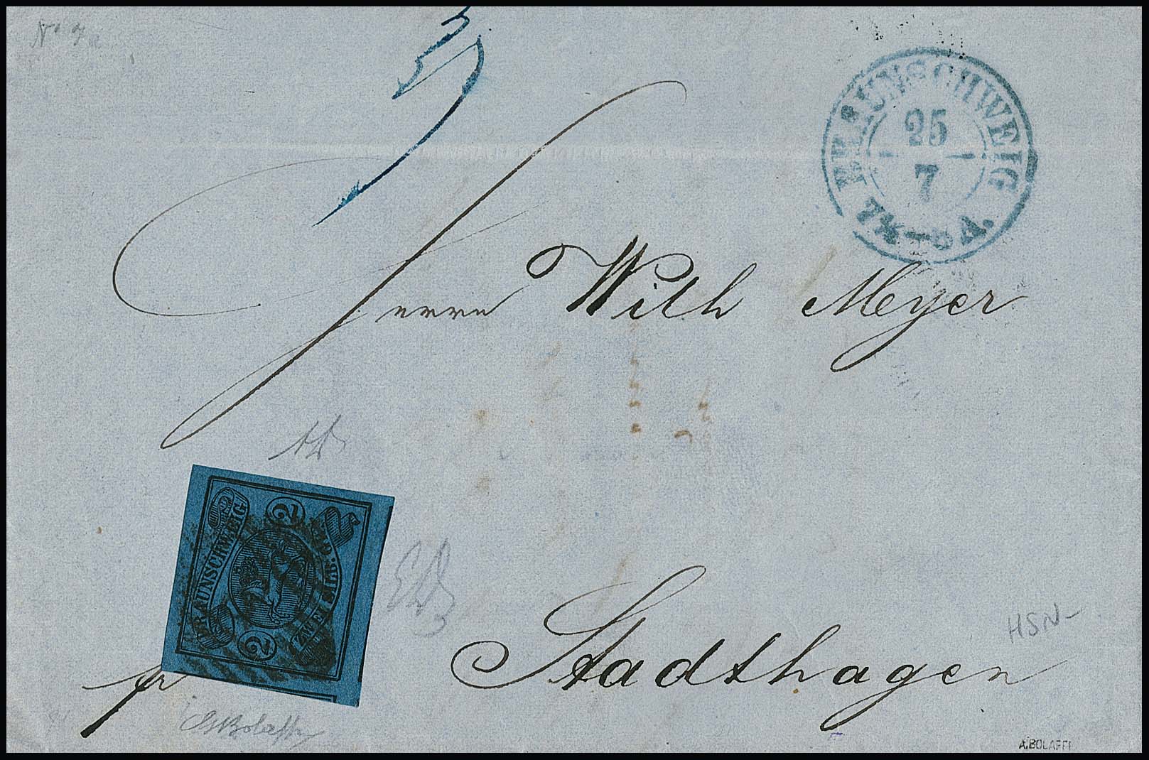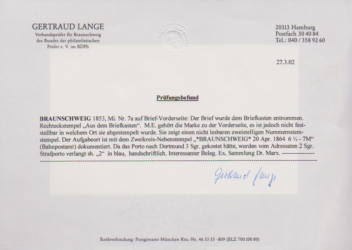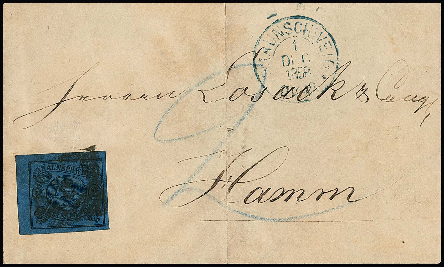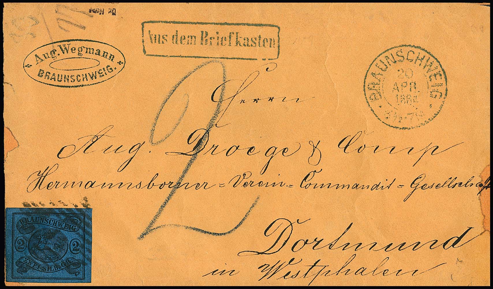 2 Sgr. schw./blau, Kabinettstück auf nachtaxierter beiger Briefvorderseite von Braunschweig (Neben-Ra1 "Aus dem Briefkasten") nach Dortmund, Taxe "2" Sgr., laut Fotoexp. Lange zweistelliger NS, das wäre dann "50", lt. Attest Wilderbeek eine "9"