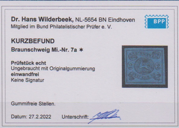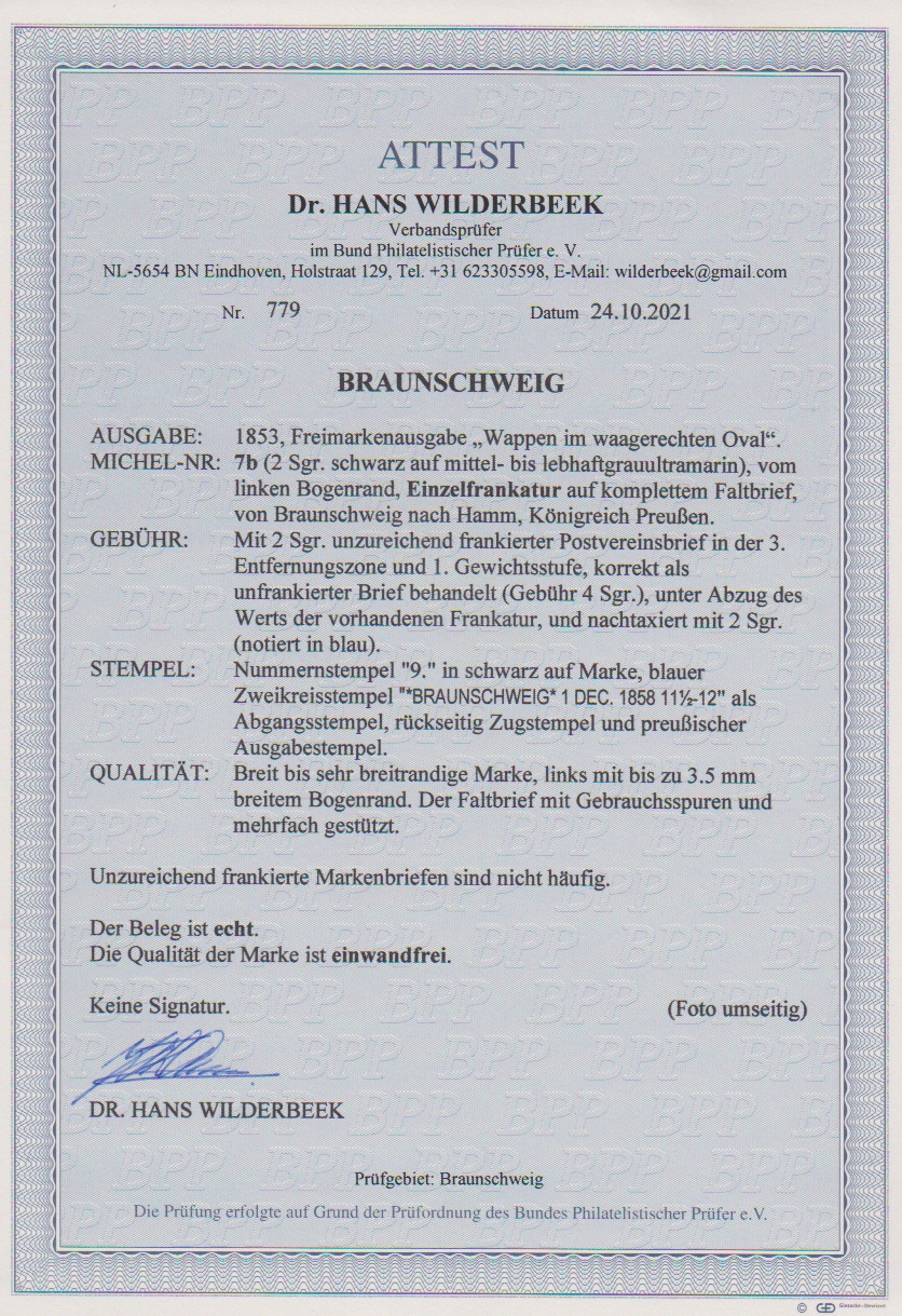 2 Sgr. schw./blau, Kabinettstück mit breitem linkem Bogenrand auf Postvereinsbrief (stärkere Mittelfalte, gestützt) von Braunschweig 1858 nach Hamm und mit "2" Sgr. Nachporto unter Anrechnung der verklebten Marke nachtaxiert, Attest Wilderbeek