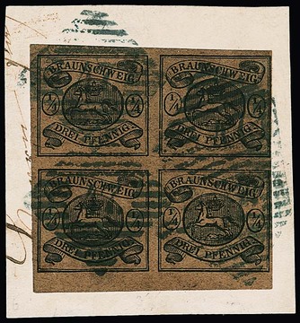 1/4 Sgr. schw./rotbraun, seltener Unterrand-Viererblock auf Briefstück mit klaren NS "47" von Wolfenbüttel. Rechte obere Marke rechts Rand angesetzt, sonst gut. Sign. mit Befund Lange. Mi. 2500,-