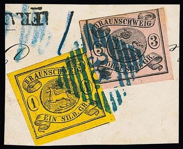 3 Sgr. schw./rosa (oben angeschnitten) in ungewöhnlicher Mischfrankatur mit teils riesenrandigem Kabinettstück 1 Sgr. schw./gelb auf Briefstück (von Auslandsbrief) mit blauem NS "38" von Schöppenstedt, sign. C.H. Lange