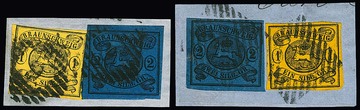 2 Sgr. schw./blau, je Kabinettstücke nebst 1 Sgr. schw./dunkelgelb bzw. nächste Ausgabe 1 Sgr. schw./gelb auf zwei Briefstücken, eine Fotoexp. Lange