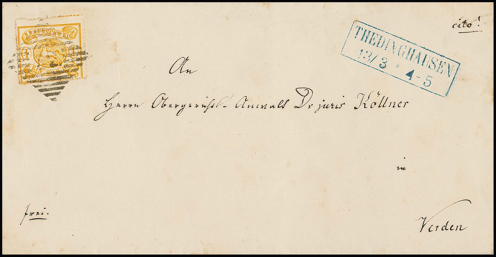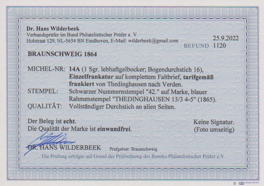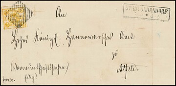 1 Sgr. gelborange, guter Liniendurchstich in üblicher Beschaffenheit, auf Prachtbrief (re. Falte ausserhalb) mit NS "40" und Ra2 "Stadtoldendorf". Attest Brettl "in noch tadelloser Erhaltung". Mi. 1200,-