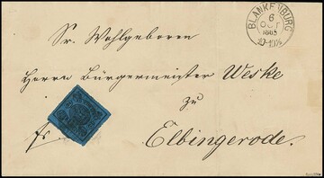 2 Sgr. schw./blau, allseits vollständiger Durchstich, oben Nebenmarke, auf Prachtbrief von Blankenburg (NS "4" und K2) nach Elbingerode. Brief typische Mittelfalte ausserhalb und kl. Falzrest, sign. Bühler. Mi. 1200,-