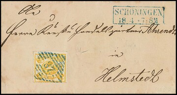 1 Sgr. gelborange mit zentr. klarem NS "37" und Ra2 "Schöningen" in blau auf kleinem Prachtbrief nach Helmstedt. Mi. 400,- +