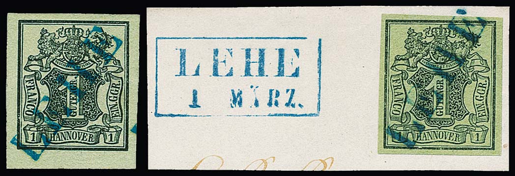 1 Ggr. schw./graugrün auf Luxusbriefstück mit blauem L1 "Lehe", Ra2 nebengesetzt, sign. Krause, dazu loses Luxus-Unterrandstück mit gleichem Stempel,ex Slg. Erivan Haub