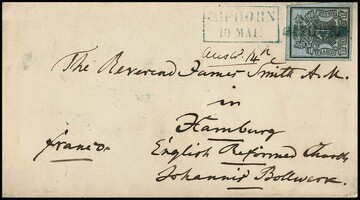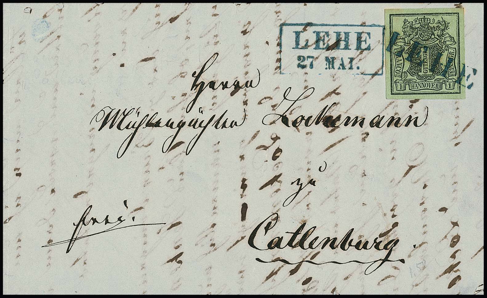1 Ggr. schw./meergrün auf Prachtbrief (innen etwas gestützt) mit übergehendem blauem L1 "Lehe" und Neben-Ra2, ex Plaggemeier, ex Slg. Erivan Haub