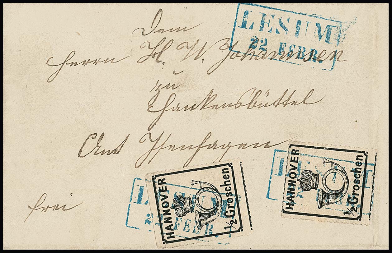 1/2 Gr. schwarz, guter rosa Gummi, per zwei, je mit vollständigem Durchstich (einmal unbedeutende Randknitterung), auf Prachtbrief mit Ra2 "Lesum" nach Hankensbüttel. Von dieser Marke seltene Mehrfach-Frankatur, aus der 25. Kruschel-Auktion 1987, sign. Szekula u.a., ex Slg. Erivan Haub