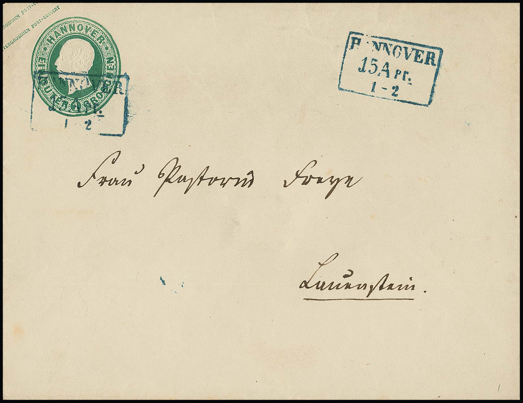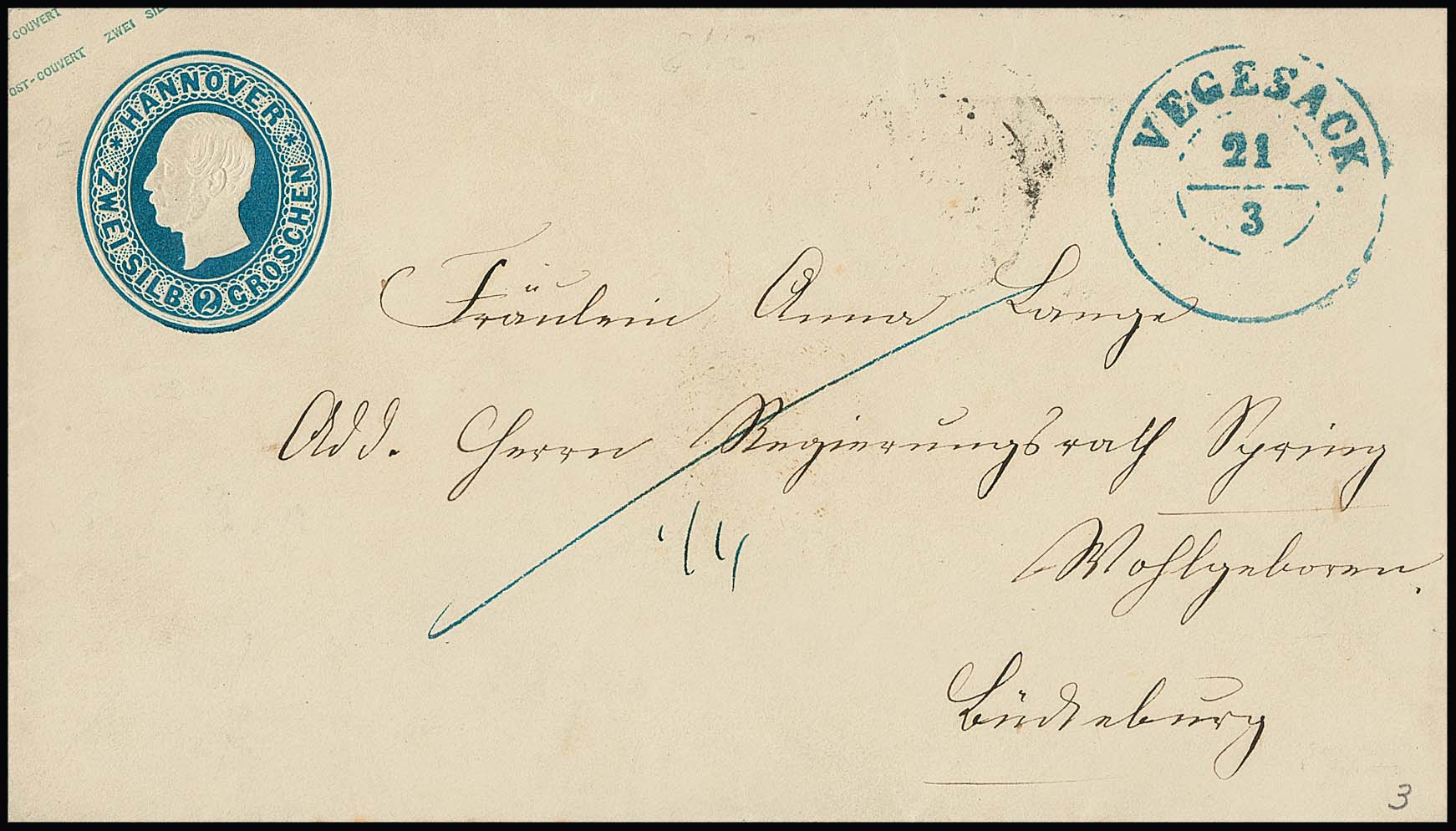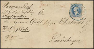 2 Gr. blau, Prachtstück mit K2 "Suhlingen" auf eingeschriebenem Expreßbrief ("Theilungssache, frei") nach Landesbergen, etwas unfrisch