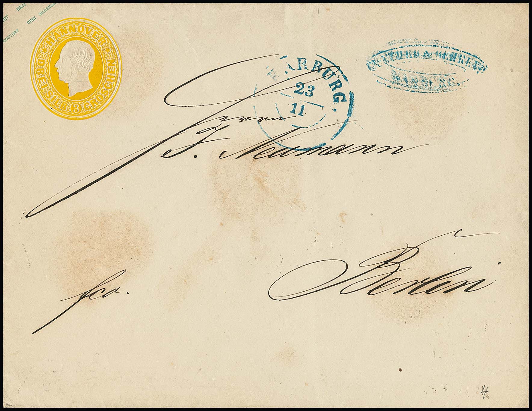 Ganzsache 3 Sgr. gelb, normales Format, sowohl gebrauchtes (K1 "Norden") als auch ungebrauchtes Kabinettcouvert, Mi. 300,-, ex Slg. Erivan Haub