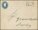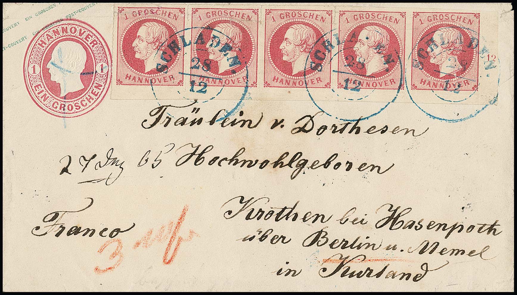 1 Gr. rosa im waagerechten Fünferstreifen aus der rechten unteren Bogenecke, rechts mit Reihenzahl "12", auf Ganzsachenumschlag 1 Gr. rosa mit klaren, blauen K2 "Schladen" nach Kurland mit Leitvermerk "über Berlin und Memel". Trotz Mängel (Streifen oben Scherentrennung und Papierverletzung durch Falte) ein wohl einmaliger Brief mit dieser Darstellung des 6 Gr.-Rußland-Portos