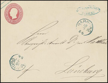 Ganzsachen 1 Ggr. grün, sowie 1 Sgr. rosa, 2 Sgr. blau (leichte Altersspuren) und 3 Sgr. gelb, alle vier Großformate gebraucht, das 1 Sgr.-Couvert unten leichte Faltspur, sonst ohne die üblichen Falten, insbesondere mit dem guten 2-Sgr.-Couvert eine seltene Serie, ex Boker. Mi. 4050,-, ex Slg. Erivan Haub