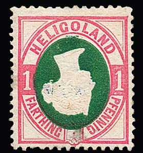1 Pfg. hellrosa/grün, der sehr seltene Berliner Neudruck mit kopfstehendem Mittelstück und kopfstehender Prägung, kl. Mgl. (oben hell), hiervon existierte nur ein Bogen zu 50 Exemplaren und diese Marke gehört zu den großen Raritäten der Helgoländer Neudrucke!